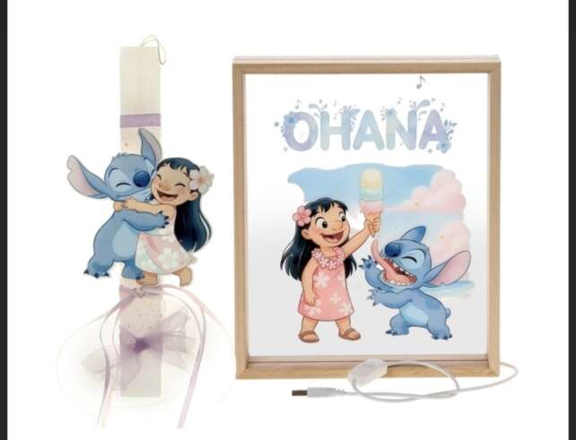 Πασχαλινό Σετ Δώρου Lilo & Stitch: Αρωματική Λαμπάδα & Ξύλινο Φωτιστικό Κάδρο LED