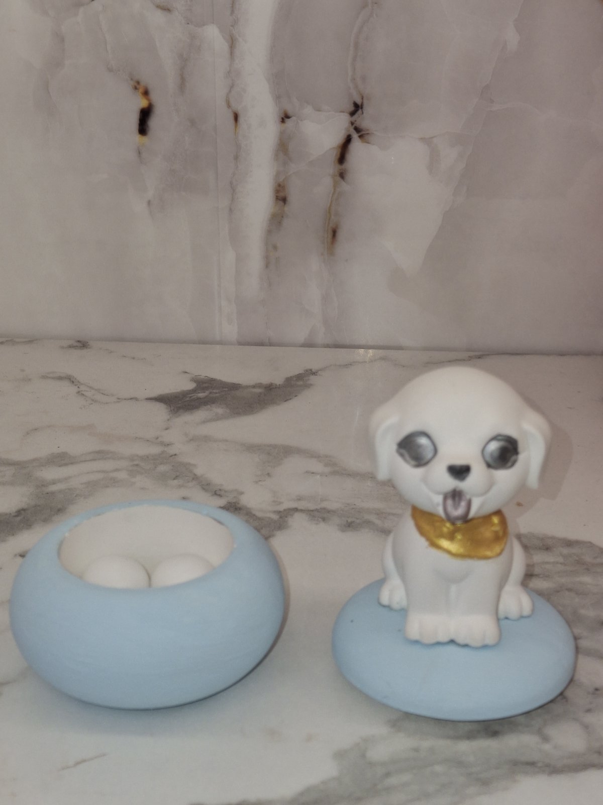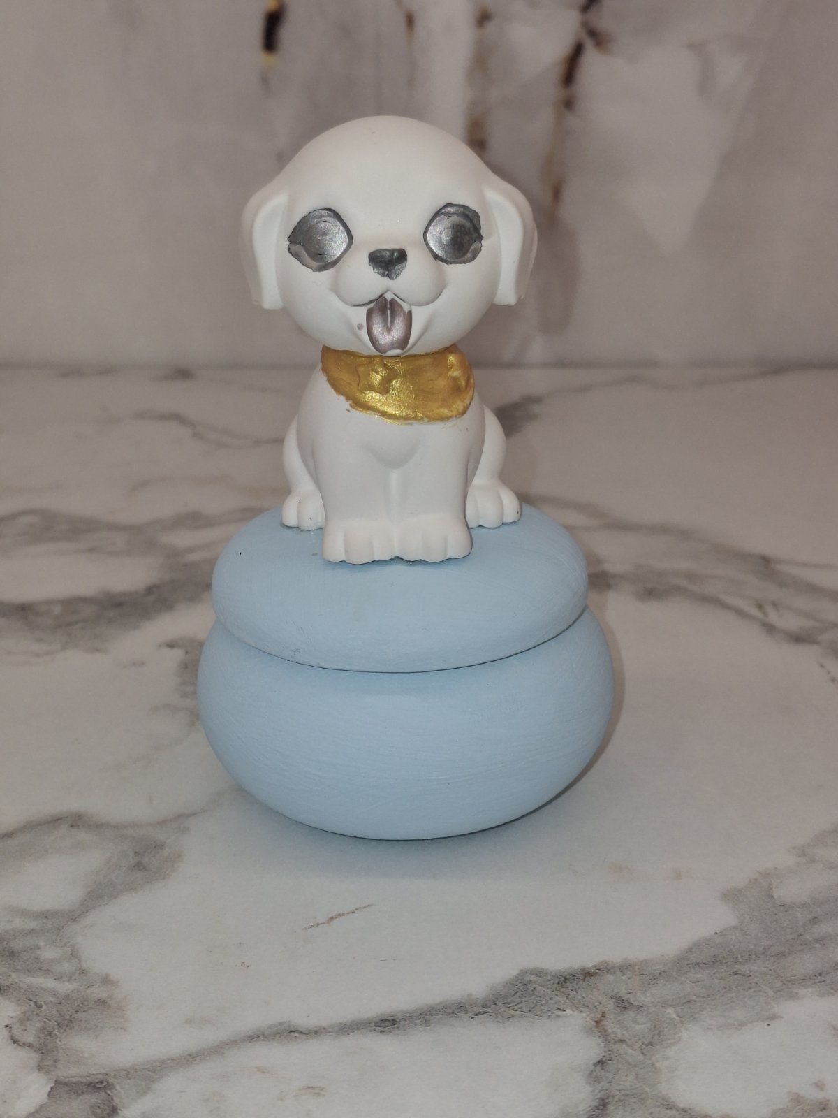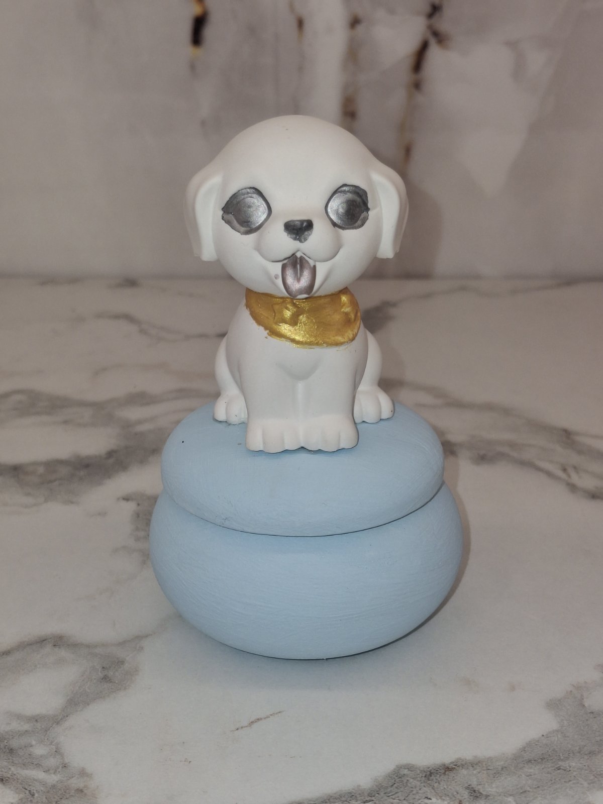 Χειροποίητο διακοσμητικό κουτάβι σε λευκή απόχρωση, τοποθετημένο πάνω σε στρογγυλό κουτί μάκαρον σε baby blue χρώμα. Οι λεπτομέρειες σε χρυσό στον λαιμό και οι ασημί πινελιές στο πρόσωπο χαρίζουν μια κομψή αλλά παιχνιδιάρικη αισθητική.