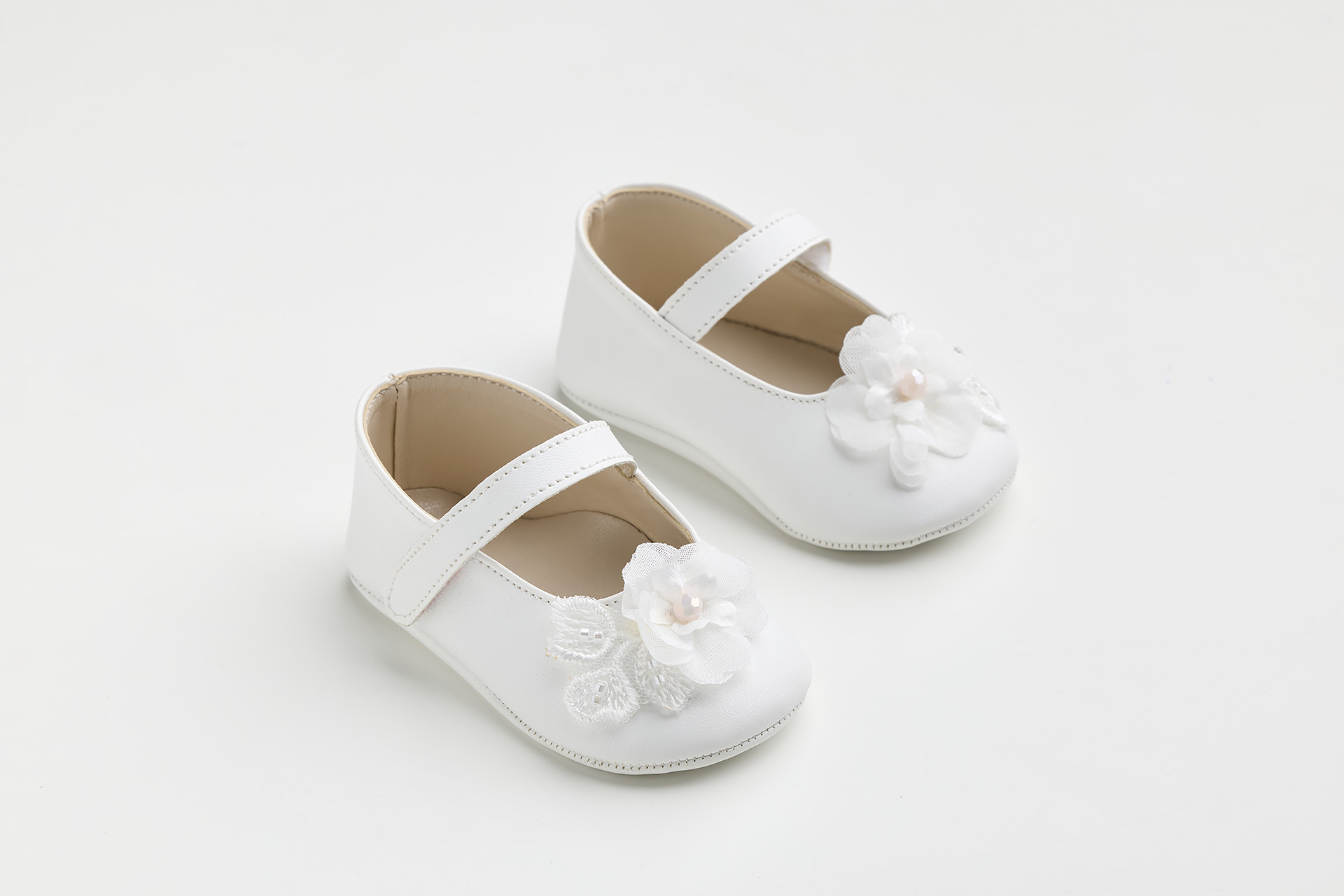 Μπαλαρίνα αγκαλιάς σε λευκό τεχνόδερμα με χειροποίητο διακοσμητικό λουλούδι.