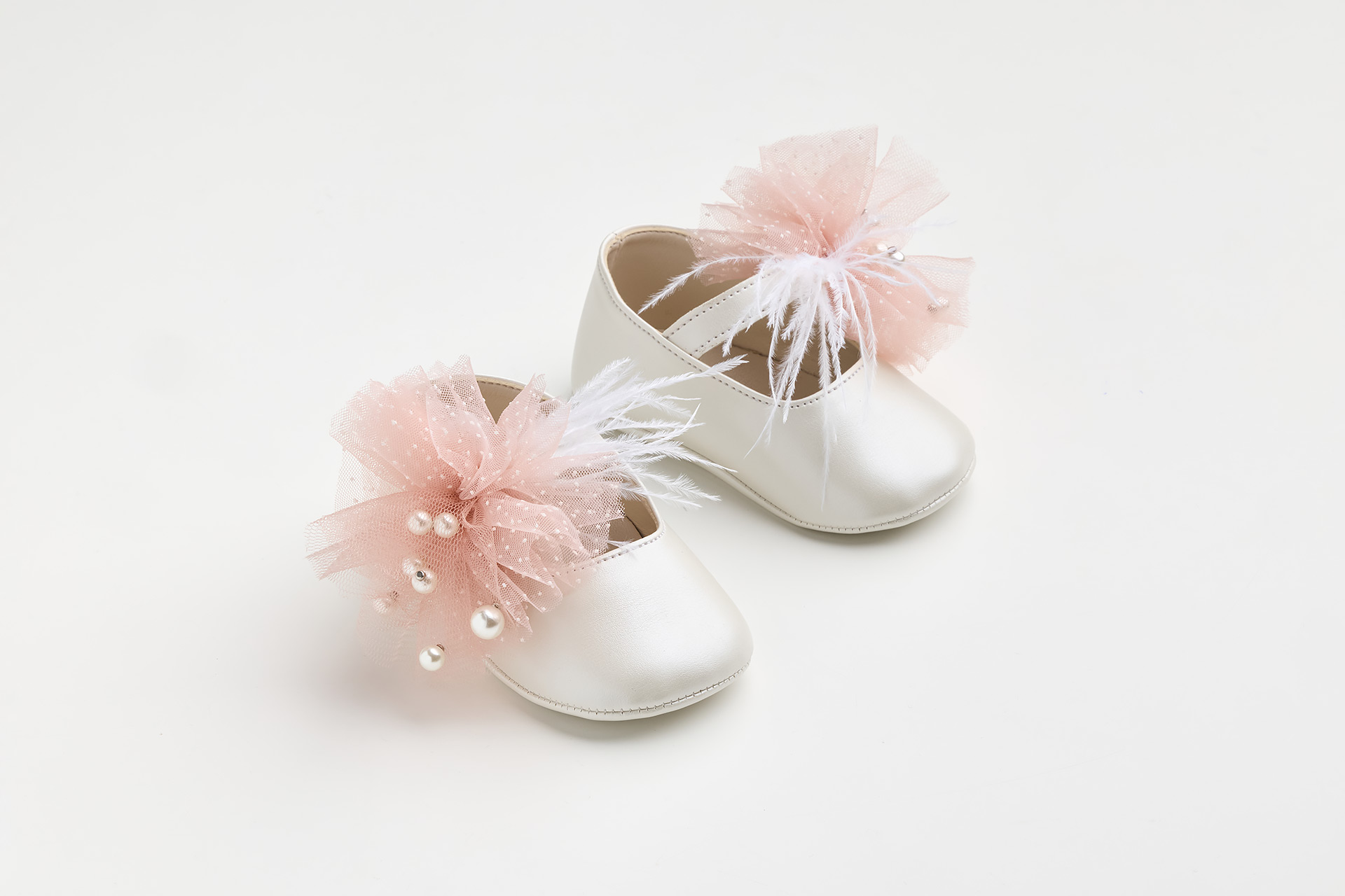 Μπαλαρίνα αγκαλιάς σε εκρού τεχνόδερμα με χειροποίητο διακοσμητικό από σάπιο μήλο πουα τούλι πέρλες και φτερά.