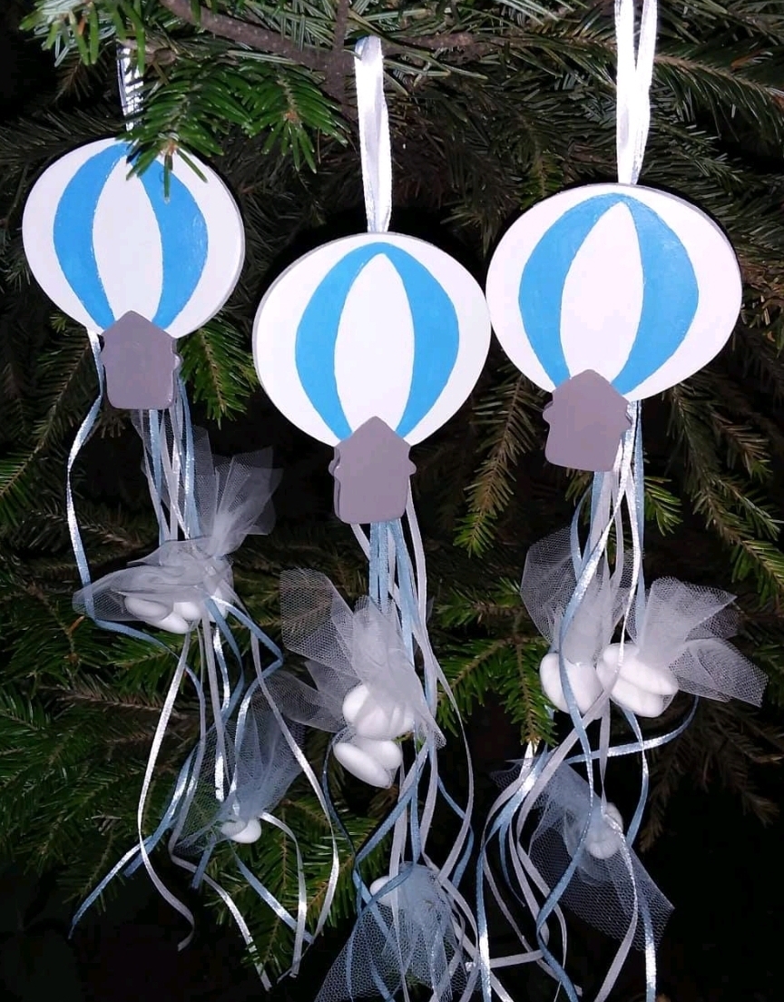 Χειροποίητη μπομπονιέρα σε σχήμα αερόστατου σε λευκή και γαλάζια απόχρωση, με minimal και κομψή αισθητική. Διακοσμημένη με σατέν κορδέλες και τούλι που αγκαλιάζει τα κουφέτα, δημιουργώντας αέρινη και παιχνιδιάρικη κίνηση.