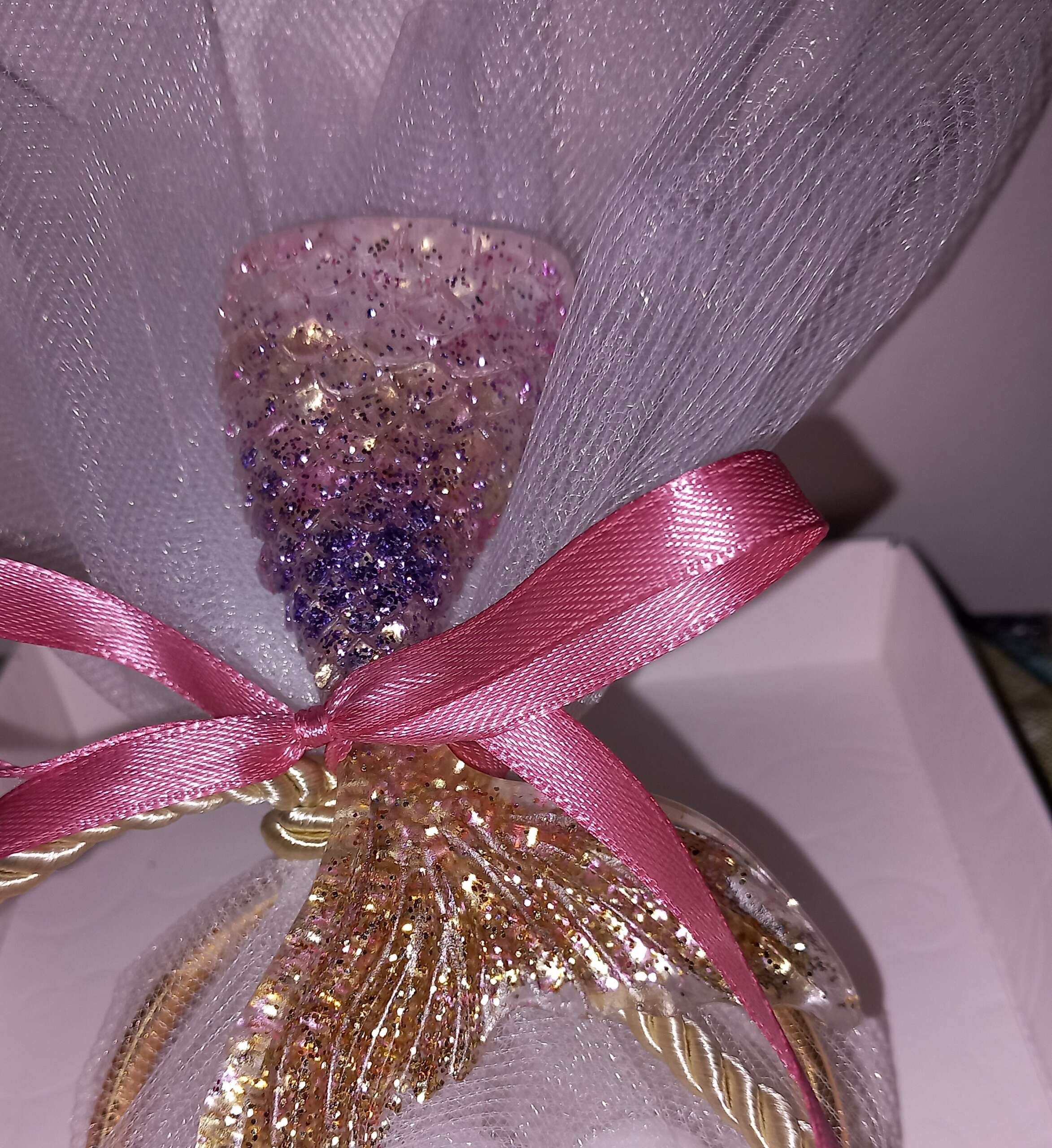 Εντυπωσιακή μπομπονιέρα βάπτισης με χειροποίητη γοργονοουρά από υγρό γυαλί  σε αποχρώσεις ροζ, λιλά και χρυσού glitter, που χαρίζει μοναδική λάμψη και πολυτελές αποτέλεσμα.