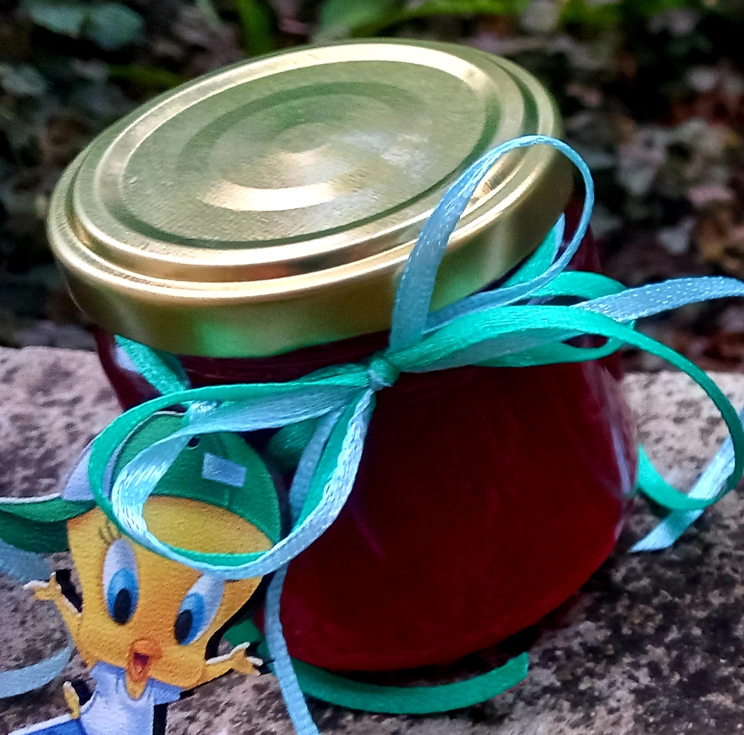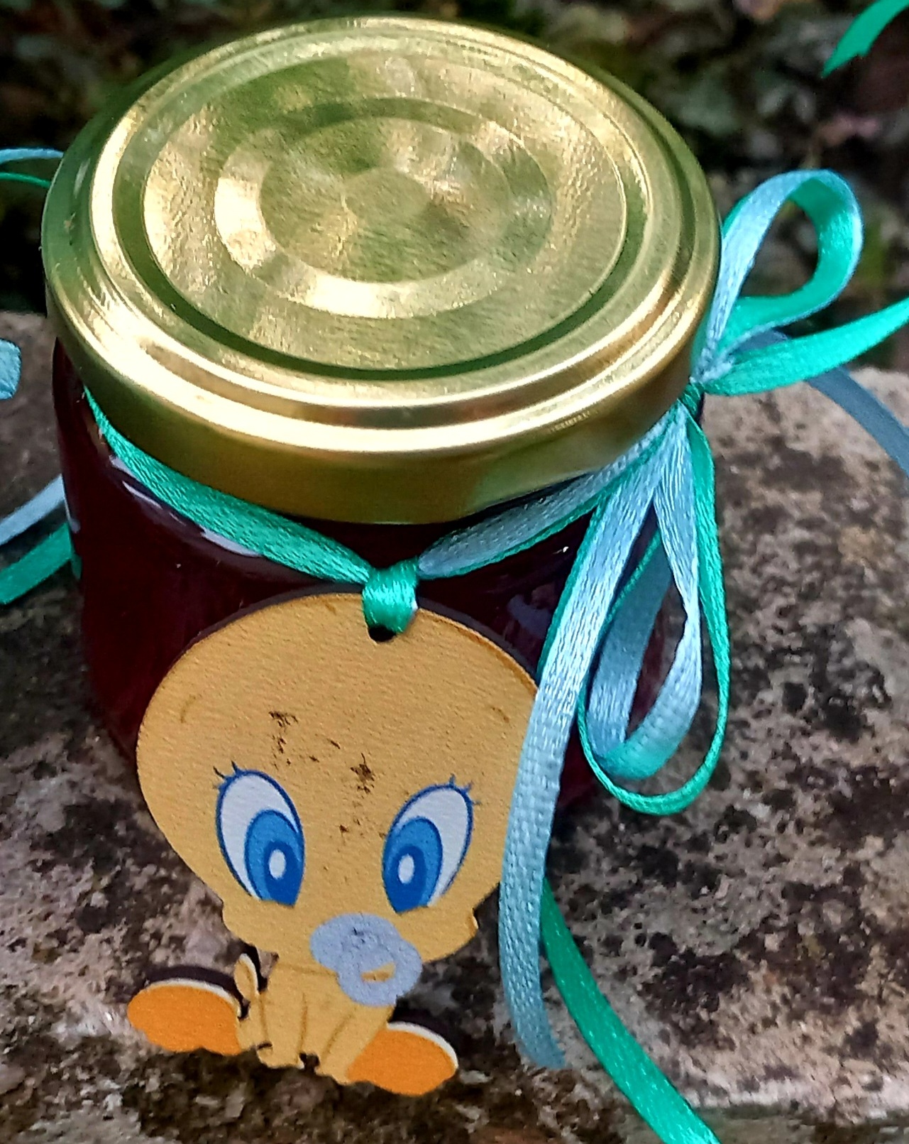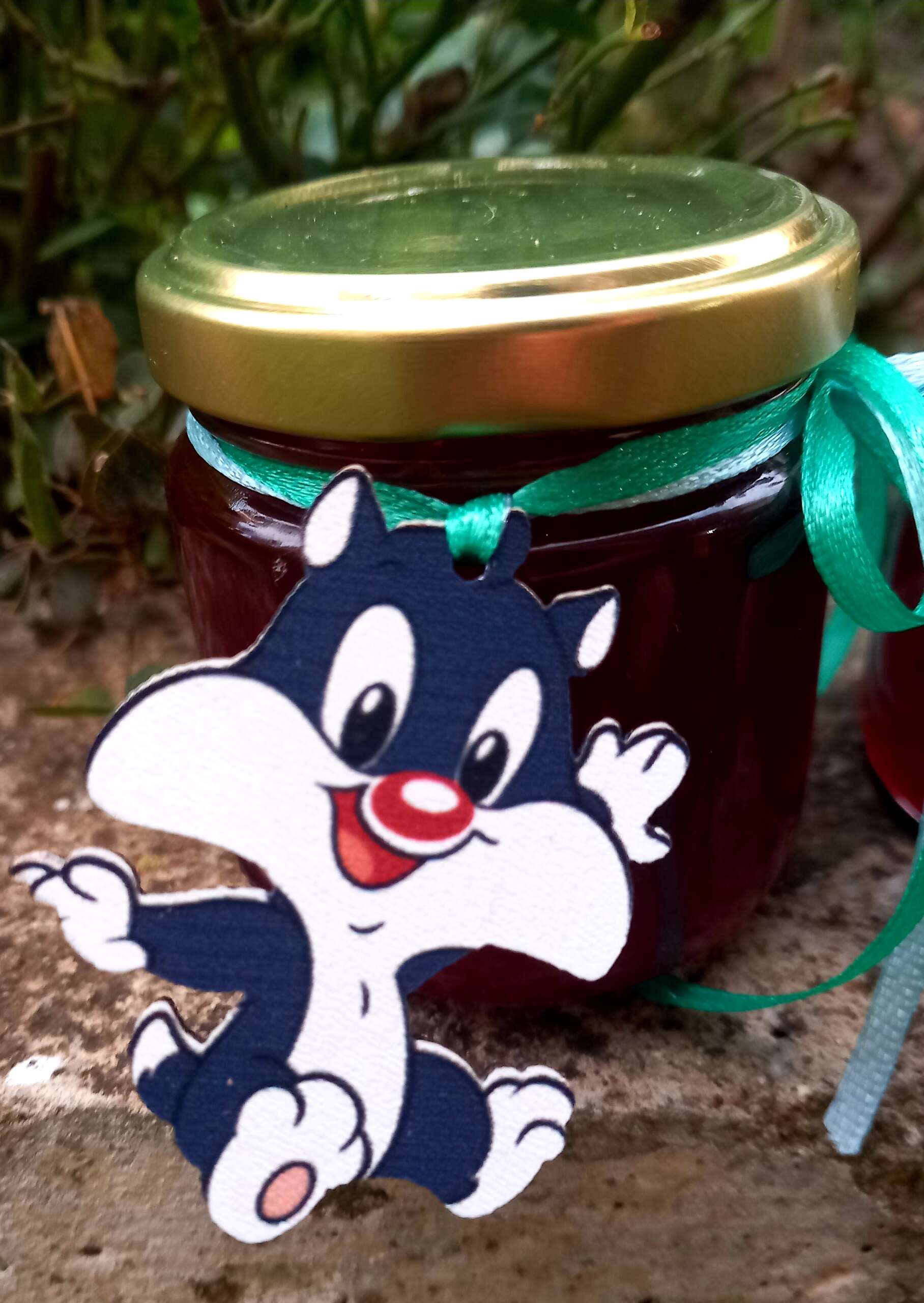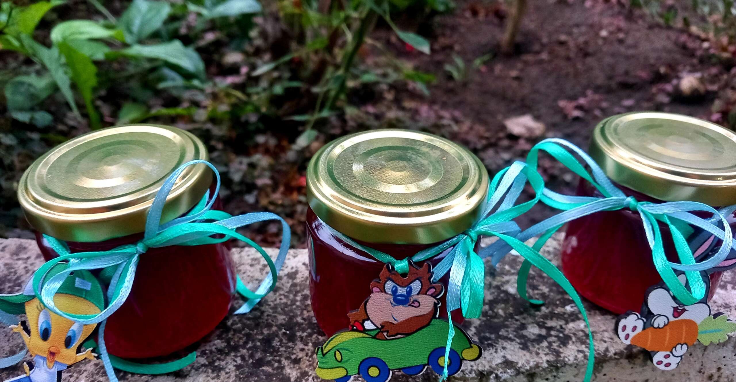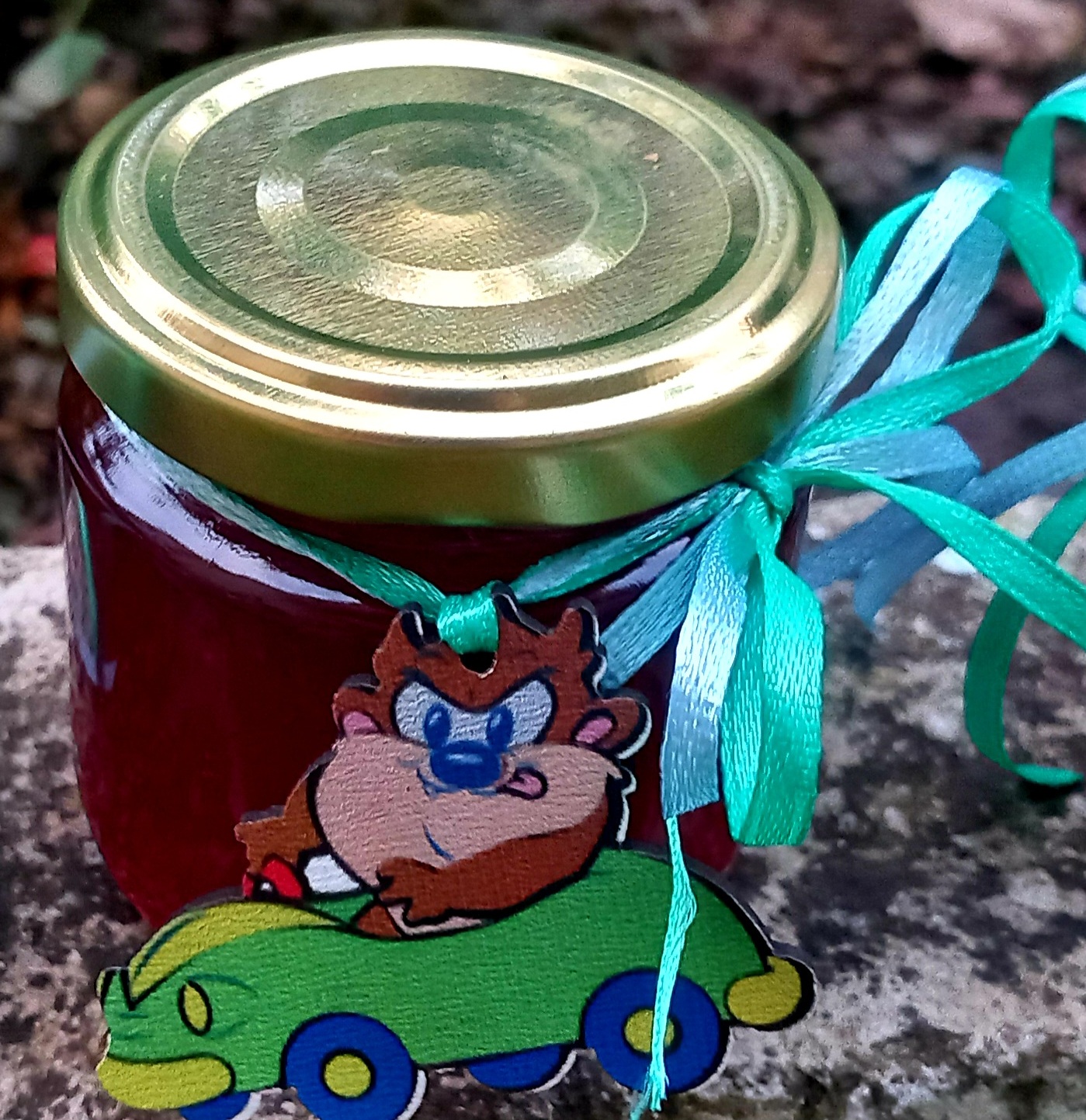 Γυάλινο βαζάκι με χρυσό καπάκι, γεμισμένο με γλυκό (μαρμελάδα ή μέλι), διακοσμημένο με σατέν κορδέλα και θεματικό ξύλινο μαγνητάκι cartoon. Ένα γλυκό αναμνηστικό που θα ενθουσιάσει μικρούς και μεγάλους.