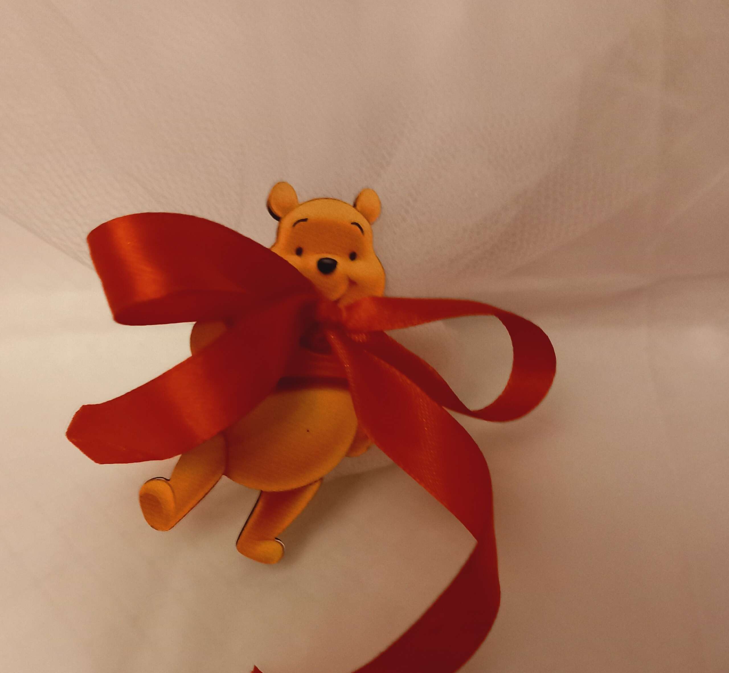 Χαρούμενη και ξεχωριστή μπομπονιέρα βάπτισης με θέμα Winnie the Pooh, διακοσμημένη με λευκό τούλι και εντυπωσιακή σατέν κόκκινη κορδέλα.