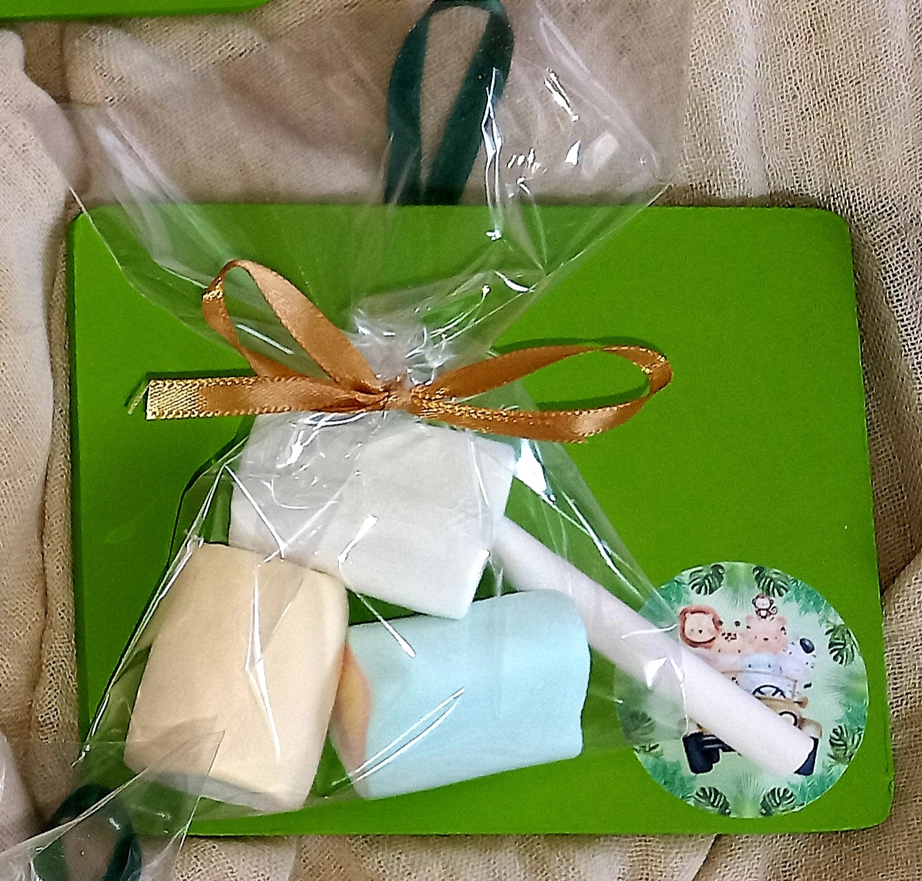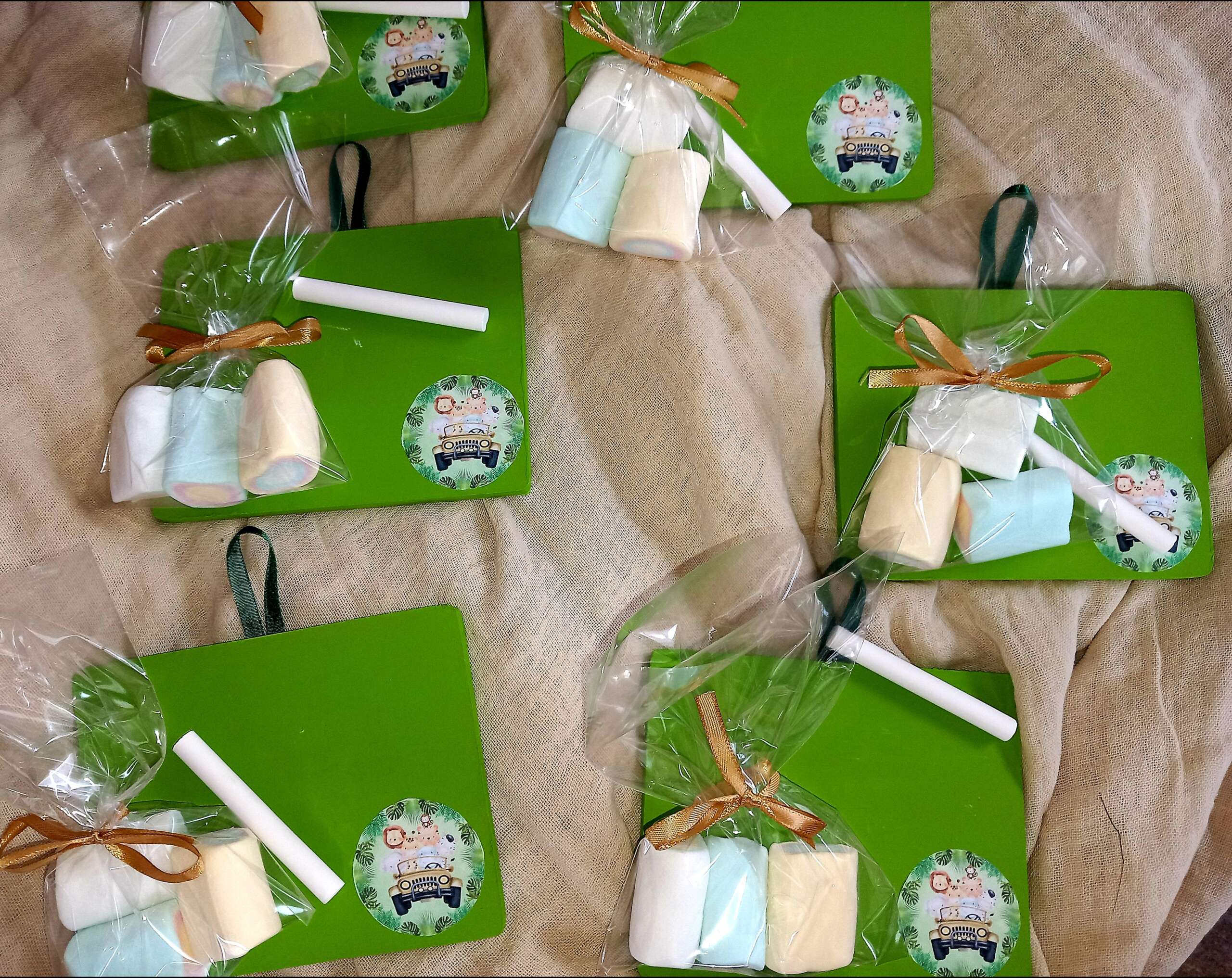 Ξύλινο πινακάκι με κιμωλία σε ζωηρό πράσινο χρώμα, διακοσμημένη με αυτοκόλλητο safari (ζωάκια σε τζιπ), που συνδυάζεται με marshmallows σε παστέλ αποχρώσεις και μικρό διακοσμητικό ρολάκι-ευχούλα. Η σύνθεση ολοκληρώνεται με διάφανη συσκευασία και σατέν κορδέλα σε γήινους τόνους.