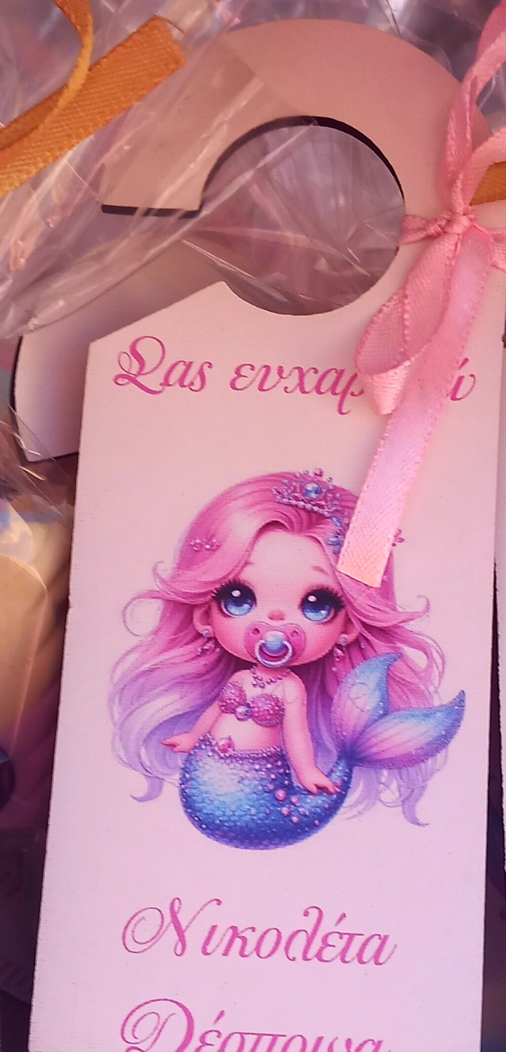 Ξύλινο διακοσμητικό ταμπελάκι σε σχήμα πόμολου πόρτας, με εκτύπωση γοργονίτσας σε παστέλ αποχρώσεις ροζ, λιλά και σιέλ. Συνοδεύεται από κορδέλα σατέν και προσωποποιημένη εκτύπωση με το όνομα της μικρής σας, δημιουργώντας ένα μοναδικό αναμνηστικό δώρο.