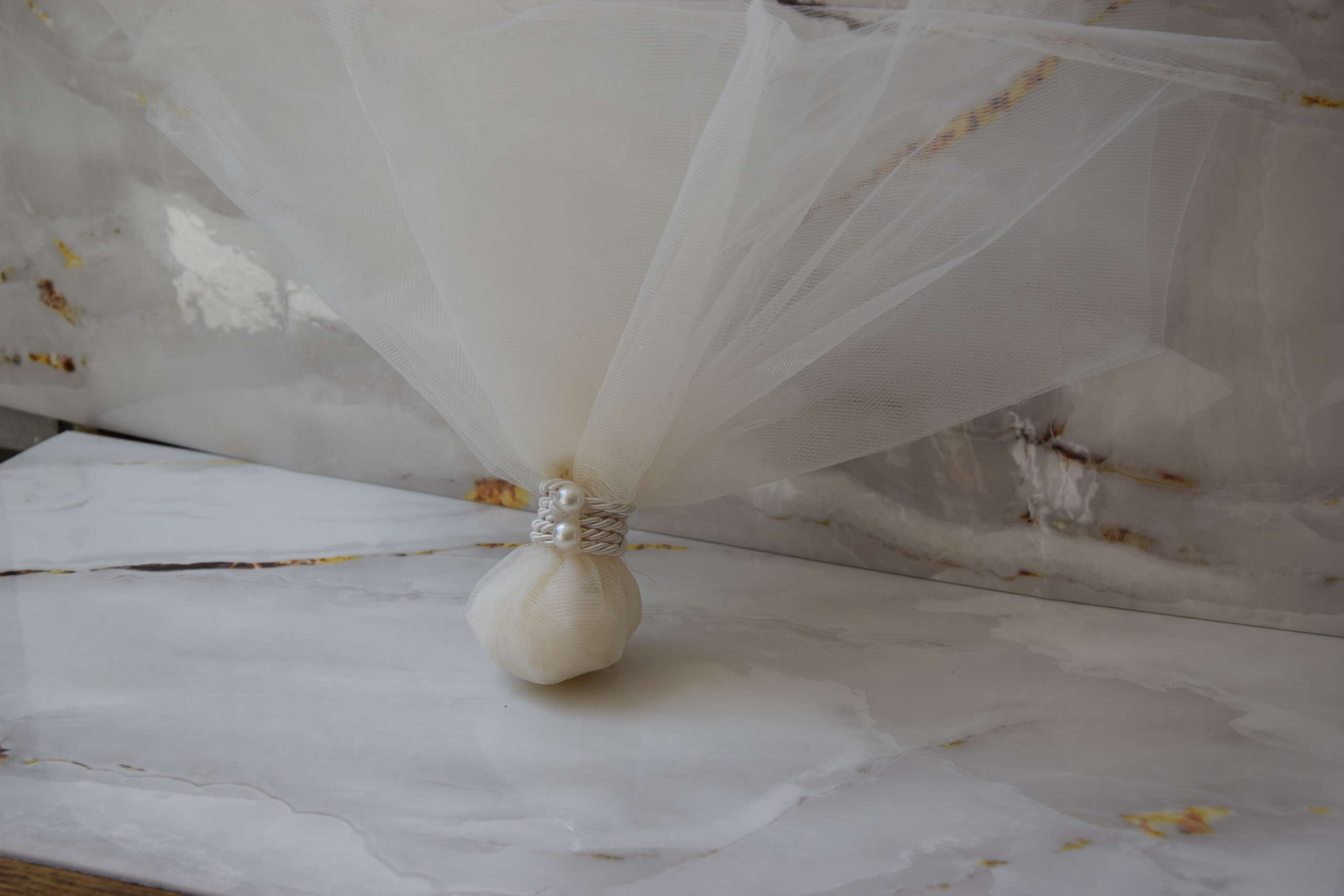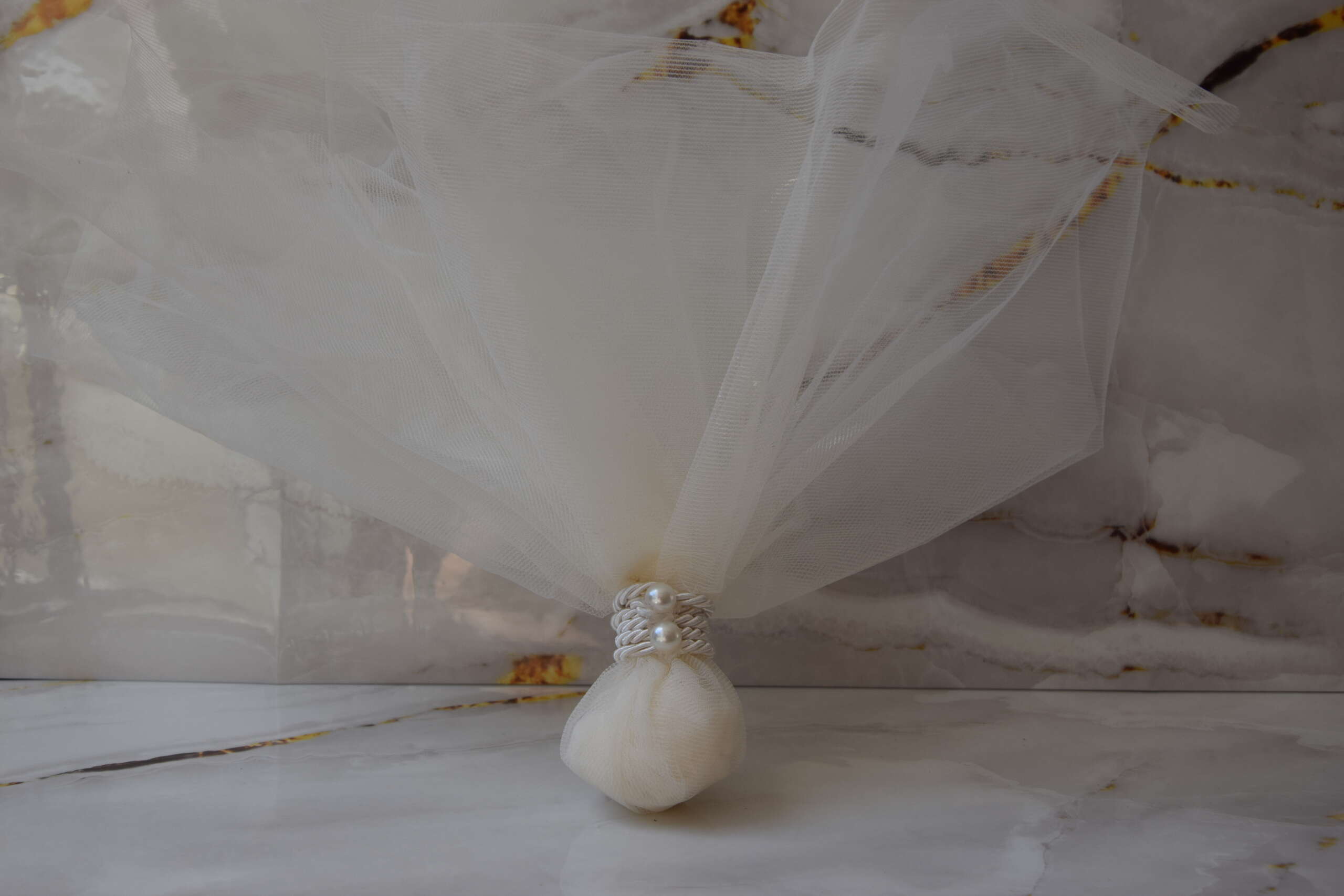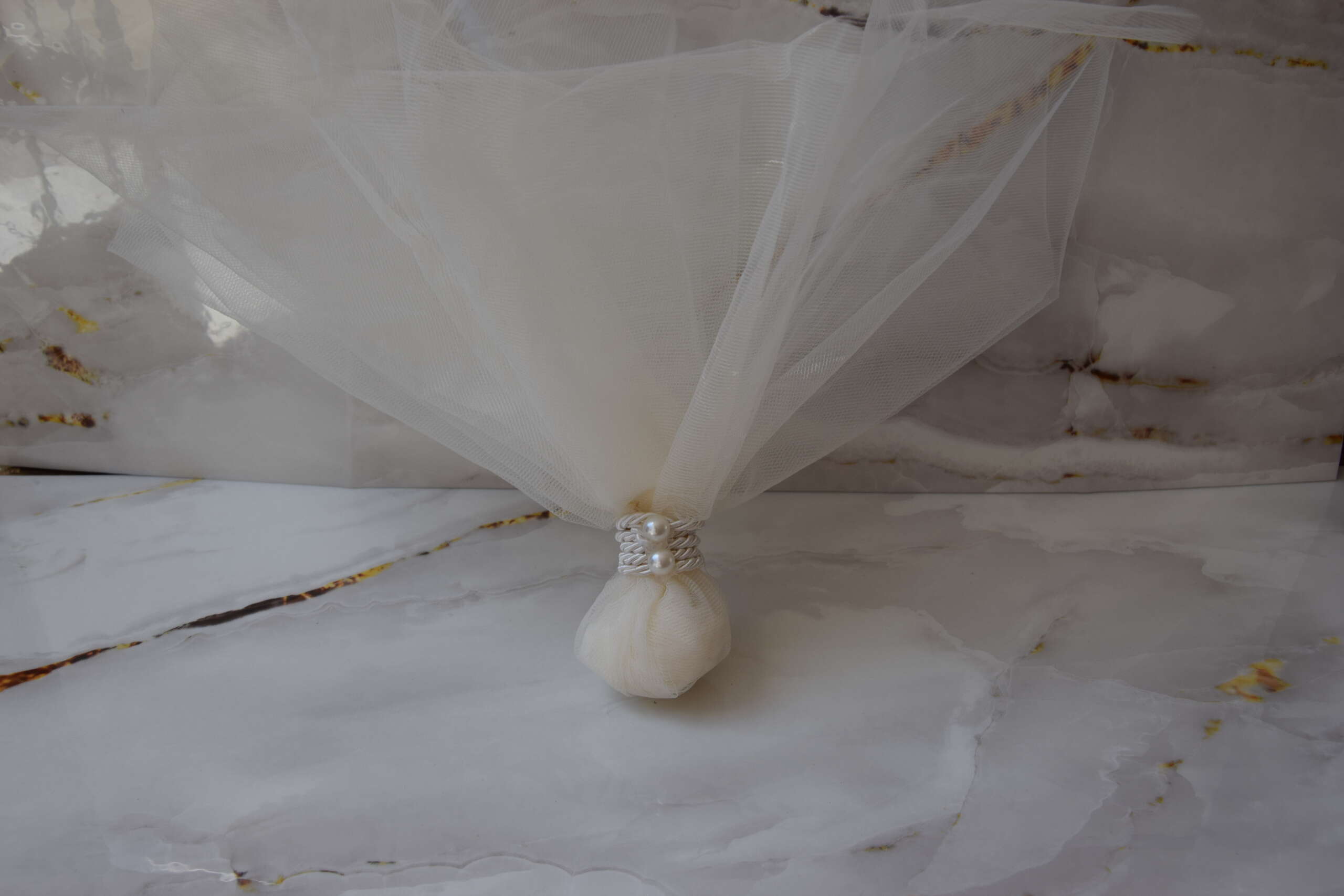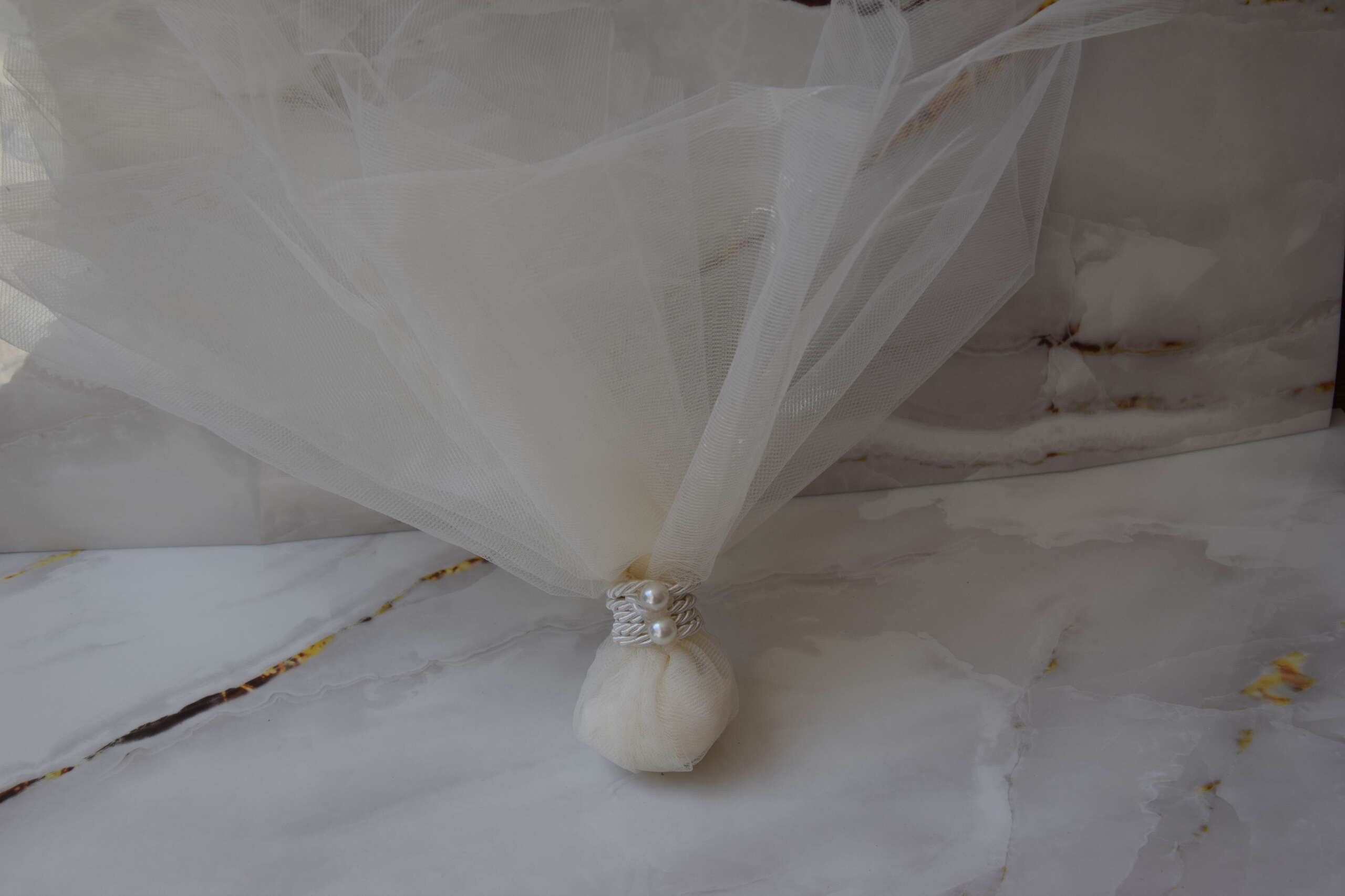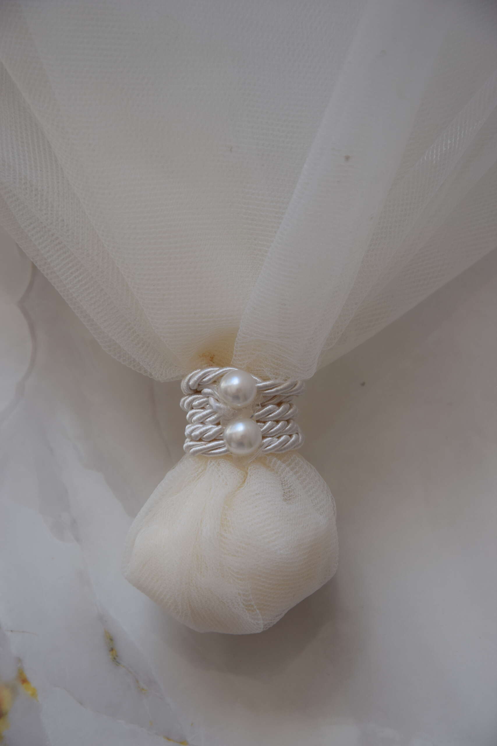 Μπομπονιέρα Γάμου Τούλι με Πέρλες & Λευκό Δέσιμο