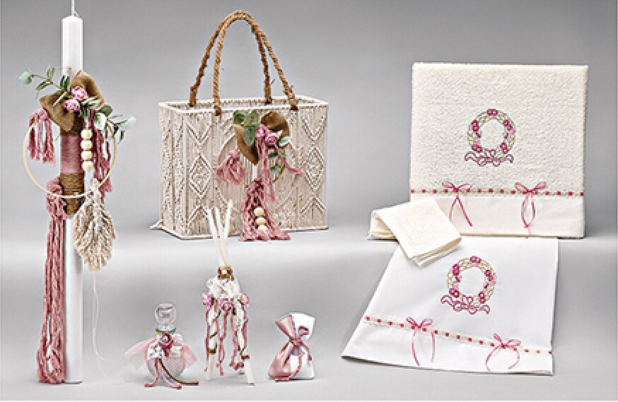 Ρομαντικό σετ βάπτισης σε φυσικούς τόνους με dusty pink λεπτομέρειες και θέμα το λουλουδένιο στεφάνι.