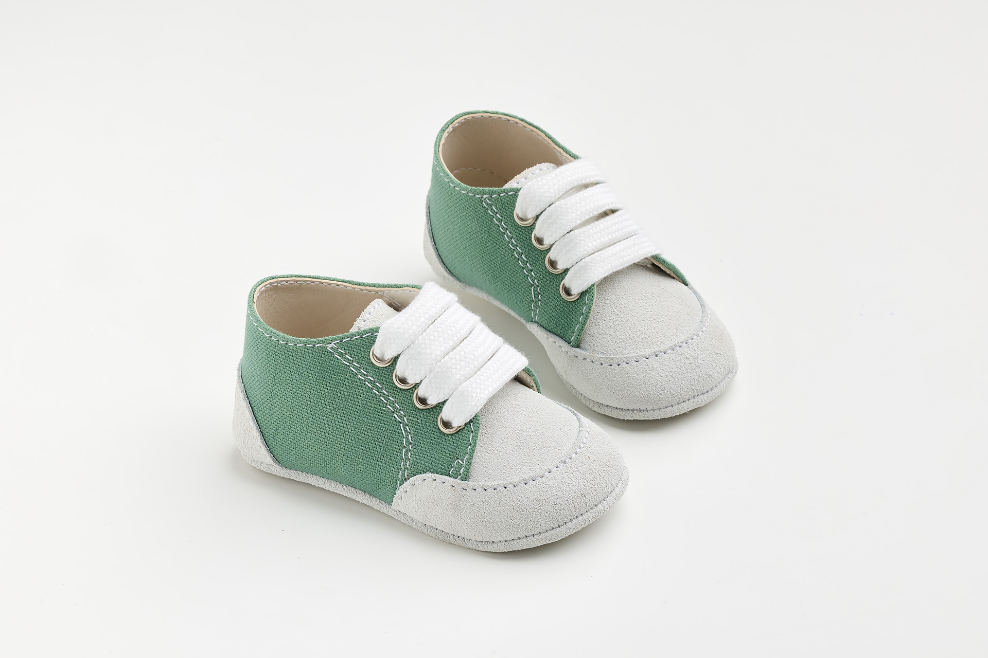 Παπουτσάκι αγκαλιάς σε λευκό καστόρ δέρμα και πράσινο ύφασμα.