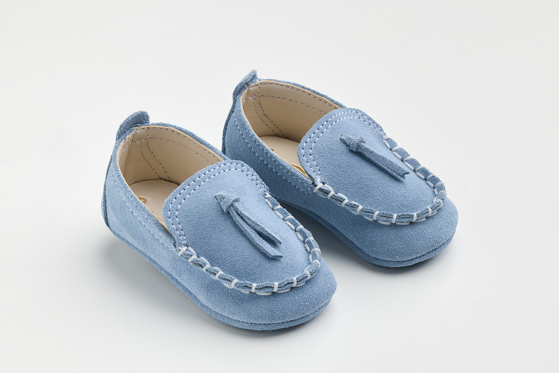 Παπουτσάκι αγκαλιάς σε γαλάζιο καστόρ δέρμα.