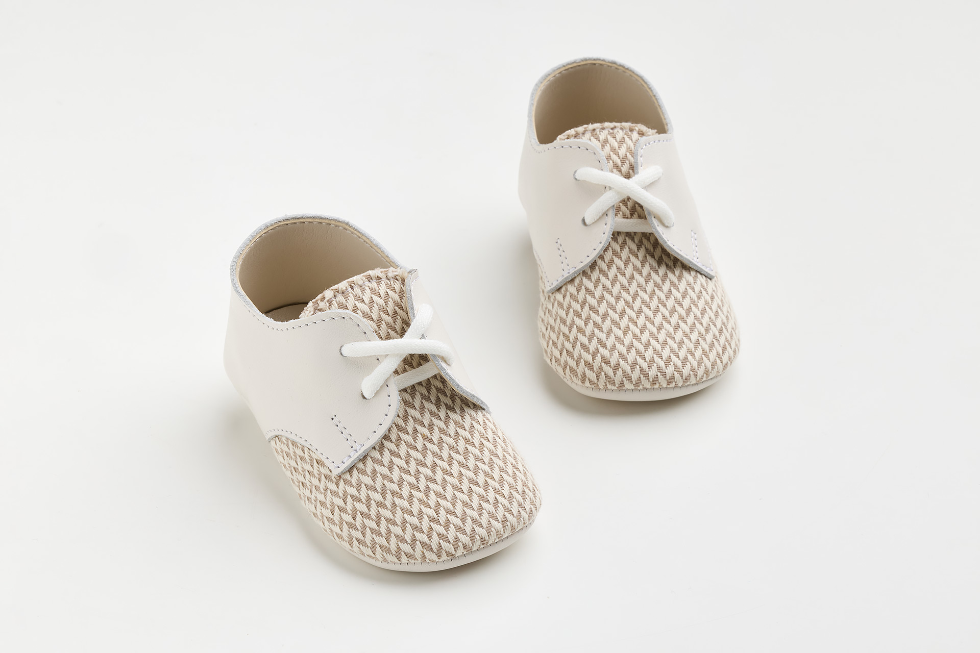 Παπουτσάκι αγκαλιάς σε εκρού λείο δέρμα και ύφασμα με μοτίβο.
