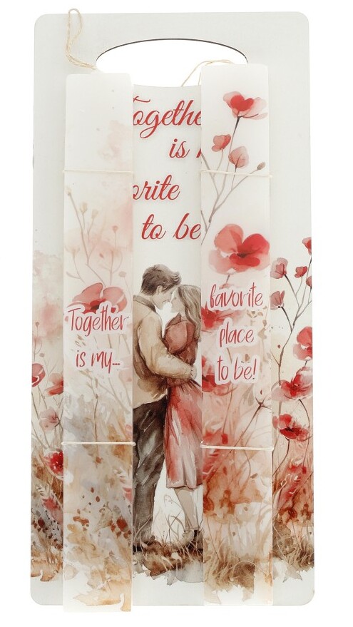 Αρωματικές χειροποίητες πασχαλινές λαμπάδες με θέμα ερωτευμένο ζευγάρι σε ξύλινη εκτυπωμένη πλάτη.