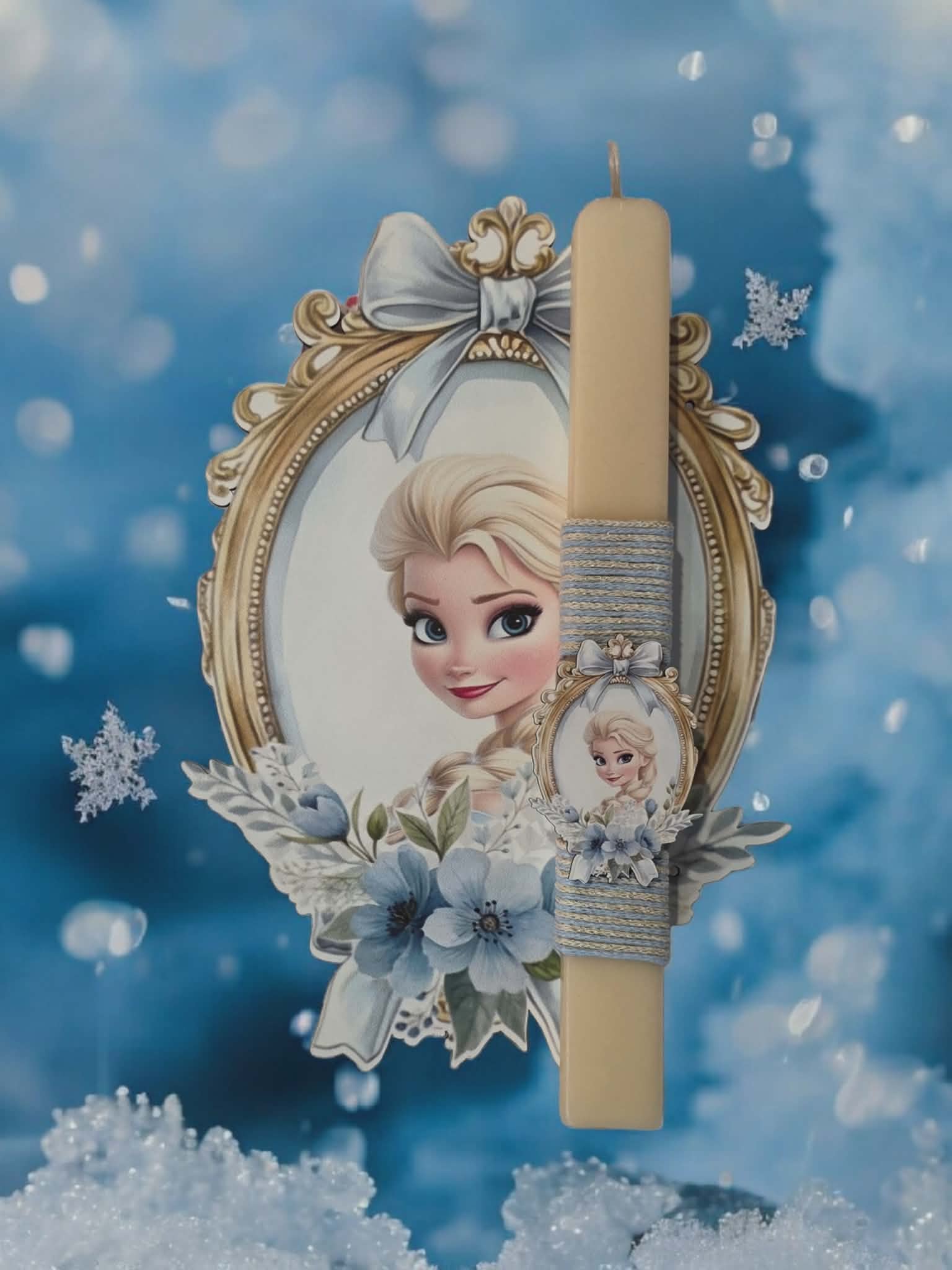 Εντυπωσιακή και κομψή πασχαλινή λαμπάδα με θέμα τη Frozen, ιδανική για κορίτσια που λατρεύουν την Elsa και τον μαγικό κόσμο του πάγου!