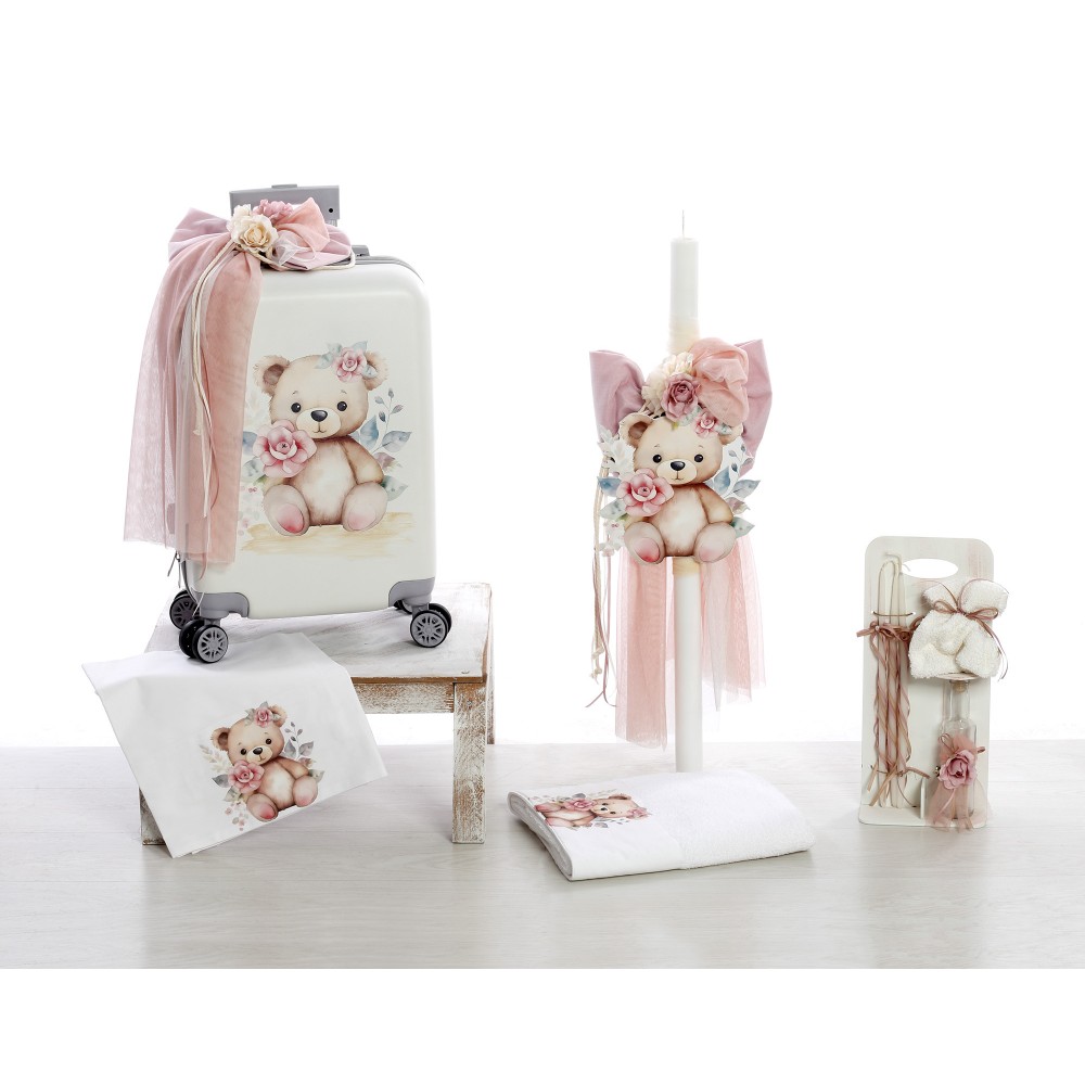 Ολοκληρωμένο βαπτιστικό σετ με θέμα το Αρκουδάκι με Λουλούδια, διακοσμημένο με υψηλής ποιότητας UV εκτύπωση σε ρομαντικές αποχρώσεις του ροζ και του λευκού. Ένα κομψό και γλυκό σετ, ιδανικό για μια ονειρική βάπτιση.