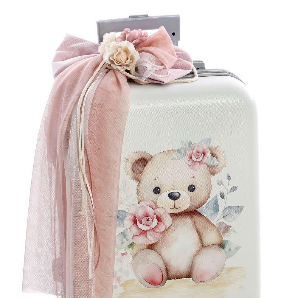 ✔ Βαλίτσα τροχήλατη με UV εκτύπωση αρκουδάκι διακοσμημένο με ρομαντικά λουλούδια και φύλλα, στολισμένη με τούλια, κορδέλες και διακριτικά στοιχεία. (Διαστάσεις: 57cm x 40cm x 22cm)