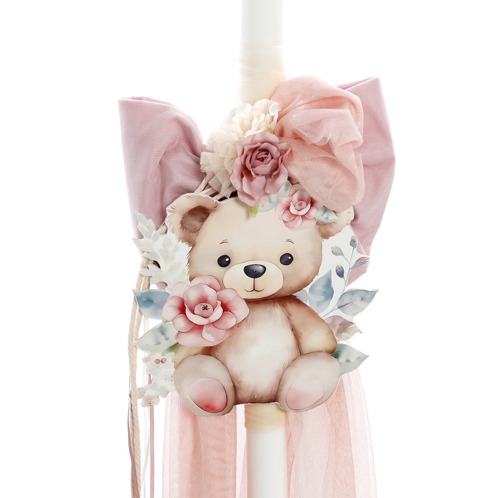 ✔ Λαμπάδα βάπτισης, διακοσμημένη με ξύλινο στοιχείο UV εκτύπωσης αρκουδάκι, τούλια, φιόγκους και λουλουδάτα διακοσμητικά.