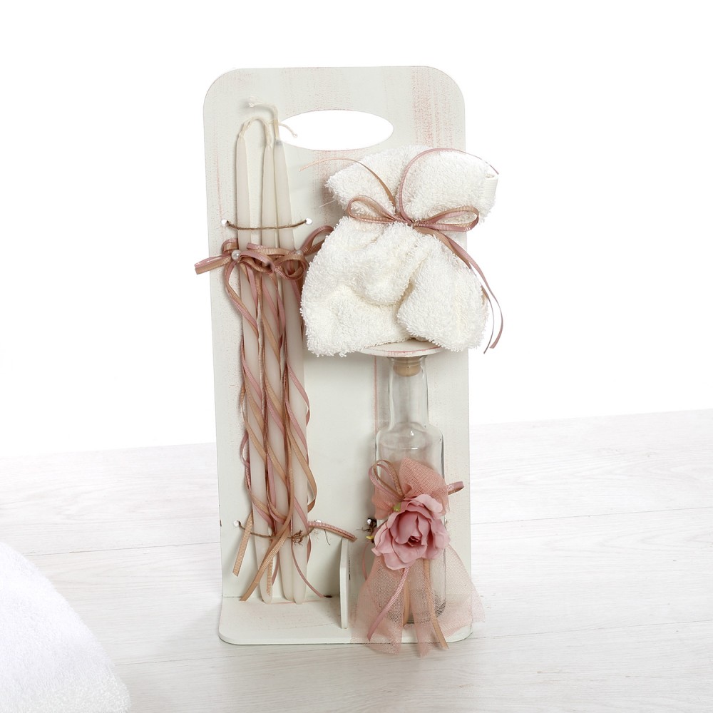✔ Σετ λαδιού με μπουκαλάκι, σαπούνι και κεράκια, διακοσμημένα σε ρομαντικό στυλ με κορδέλες και λουλούδια.