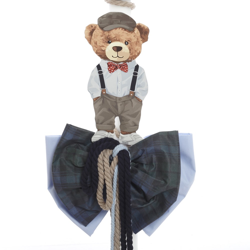 Ξύλινο Κουτί: Τετράγωνο ξύλινο κουτί αποθήκευσης σε φυσικό χρώμα. Διαθέτει εντυπωσιακή επένδυση με καρό ύφασμα και την παράσταση ενός αρκούδου με τραγιάσκα, παπιγιόν και τιράντες. Το καπάκι στολίζεται με πλούσια ναυτικά σχοινιά σε μπλε και μπεζ αποχρώσεις.