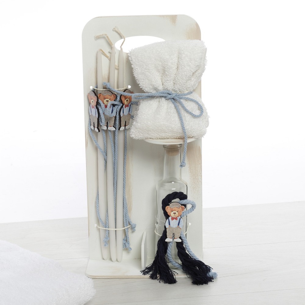 Σετ Λαδιού: Λευκό ξύλινο stand που περιλαμβάνει μπουκάλι λαδιού, σαπούνι και 3 κεράκια κολυμπήθρας, όλα διακοσμημένα με σχοινιά και μικρές φιγούρες αρκούδων.