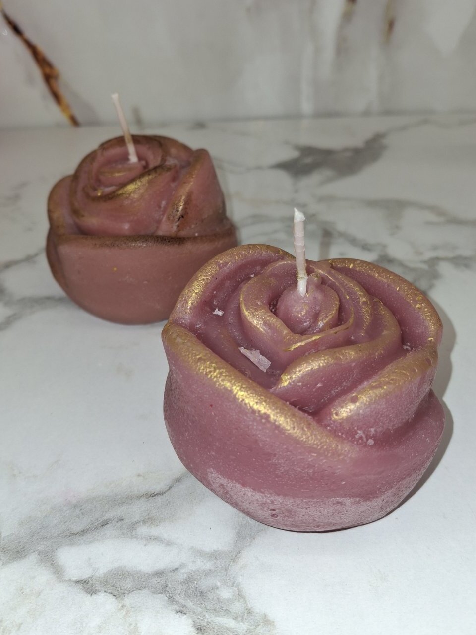 Yπέροχα χειροποίητα κεριά σόγιας σε σχήμα και άρωμα τριαντάφυλλου, σε απόχρωση σάπιο μήλο, με διακριτές χρυσές πινελιές στα πέταλα που χαρίζουν κομψότητα και μια ρομαντική, πολυτελή αίσθηση.