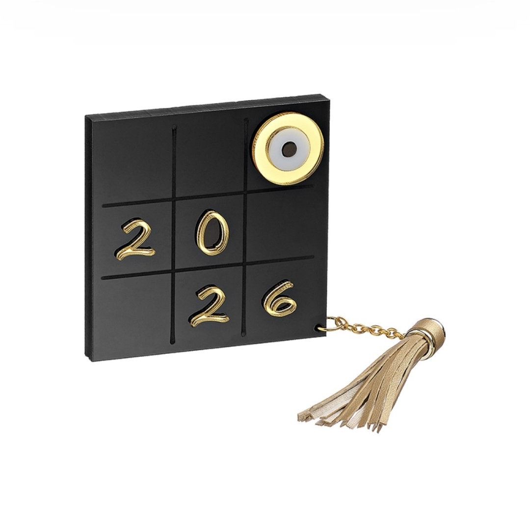 Ένα μοντέρνο και εκλεπτυσμένο γούρι σε σχήμα τρίλιζας από πλέξιγκλας, με τον αριθμό 2026 σε χρυσή μεταλλική απόχρωση.