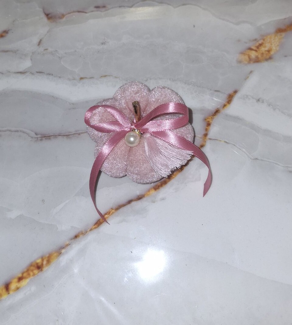 Μια υπέροχη χειροποίητη ροζ κολοκύθα, ντυμένη με βελούδινο ύφασμα και στολισμένη με σατέν ροζ φιόγκο, λευκή πέρλα και διακριτική φουντίτσα.