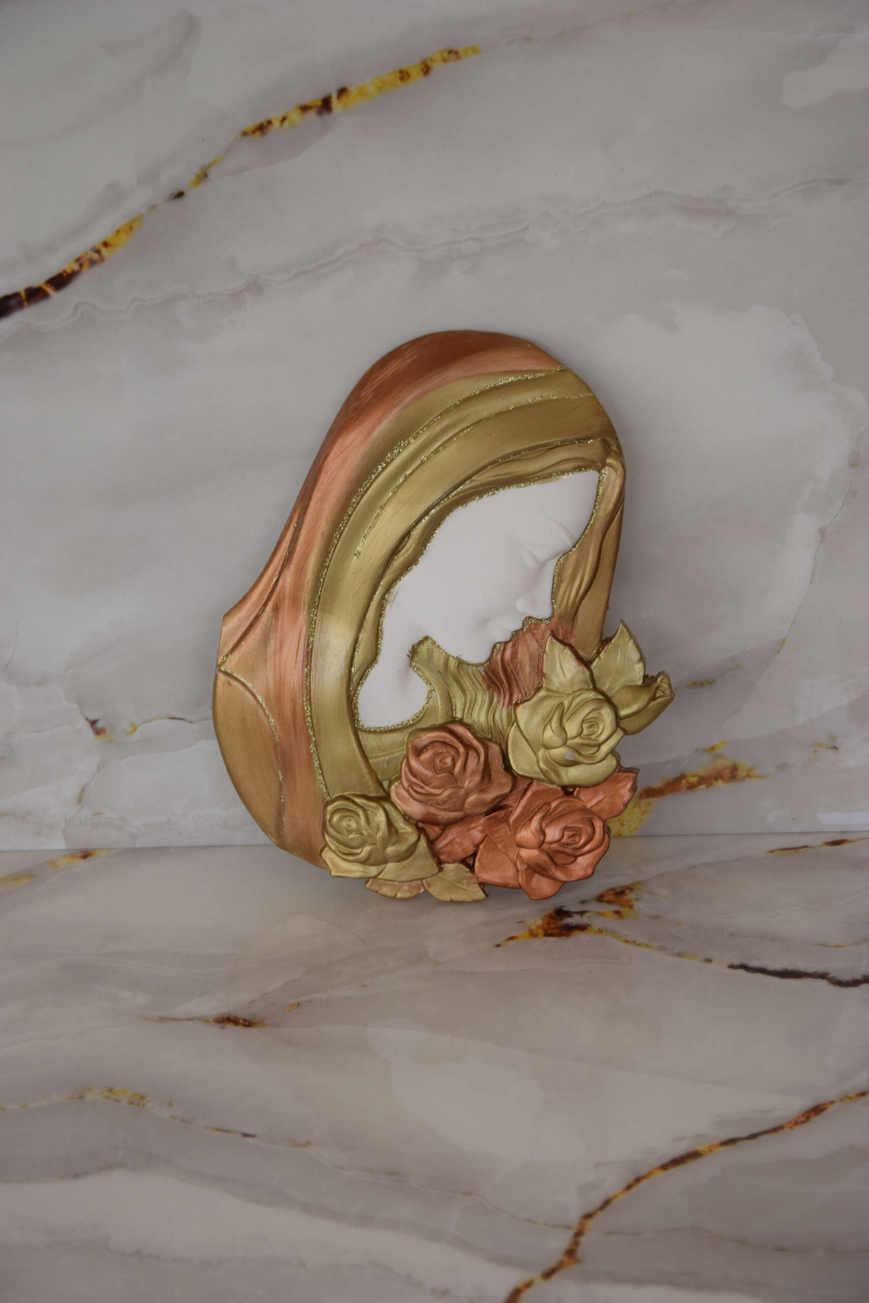 Εικόνα της Παναγίας από πορσελάνη, φιλοτεχνημένο σε γήινες αποχρώσεις χρυσού και χαλκού ή σε χρώματα που σας ταιριάζουν. Το πρόσωπο αποδίδεται με λιτές γραμμές, ενώ στη βάση του κοσμείται με ανάγλυφα τριαντάφυλλα, δίνοντας μια αίσθηση κομψότητας και γαλήνης.