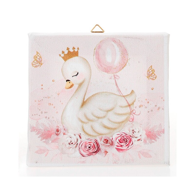 Καμβάς διακόσμησης 10×10 εκ. με σχέδιο κύκνο με στέμμα και ροζ λεπτομέρειες. Ιδανικός για μπομπονιέρα βάπτισης, παιδικό δωμάτιο ή διακόσμηση βάπτισης.