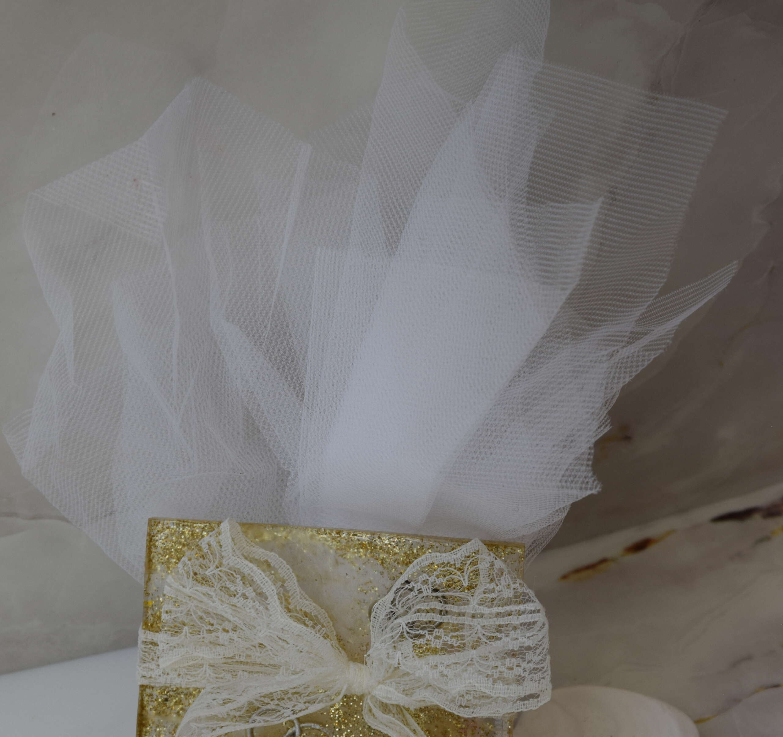 Κομψή μπομπονιέρα γάμου σουβέρ από υγρό γυαλί σε τετράγωνο σχήμα, διακοσμημένη με χρυσή λάμψη και δαντελένιο φιόγκο. Στο κέντρο ξεχωρίζει το διακοσμητικό με βέρες, σύμβολο αιώνιας ένωσης και αγάπης. Συνοδεύεται από λευκό τούλι που χαρίζει πολυτέλεια και ρομαντική διάθεση. Μια εντυπωσιακή επιλογή που θα ενθουσιάσει τους καλεσμένους σας. Τα χρώματα μπορεί να διαφέρουν αν ζητηθεί.