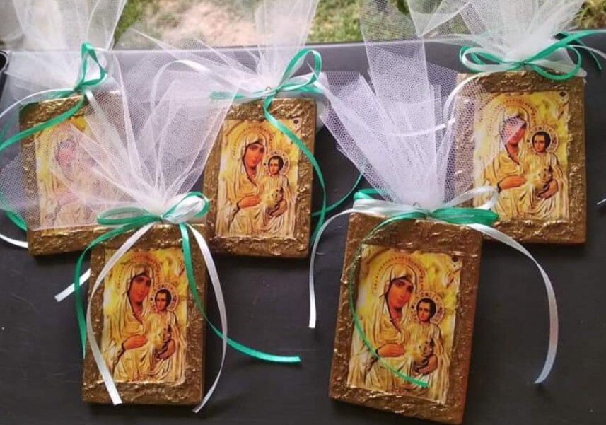 Όμορφες και ιδιαίτερα καλαίσθητες μπομπονιέρες με εικόνα της Παναγίας και του Θείου Βρέφους, διακοσμημένες με χρυσή παλαίωση που δίνει αίσθηση πολυτέλειας και παράδοσης.