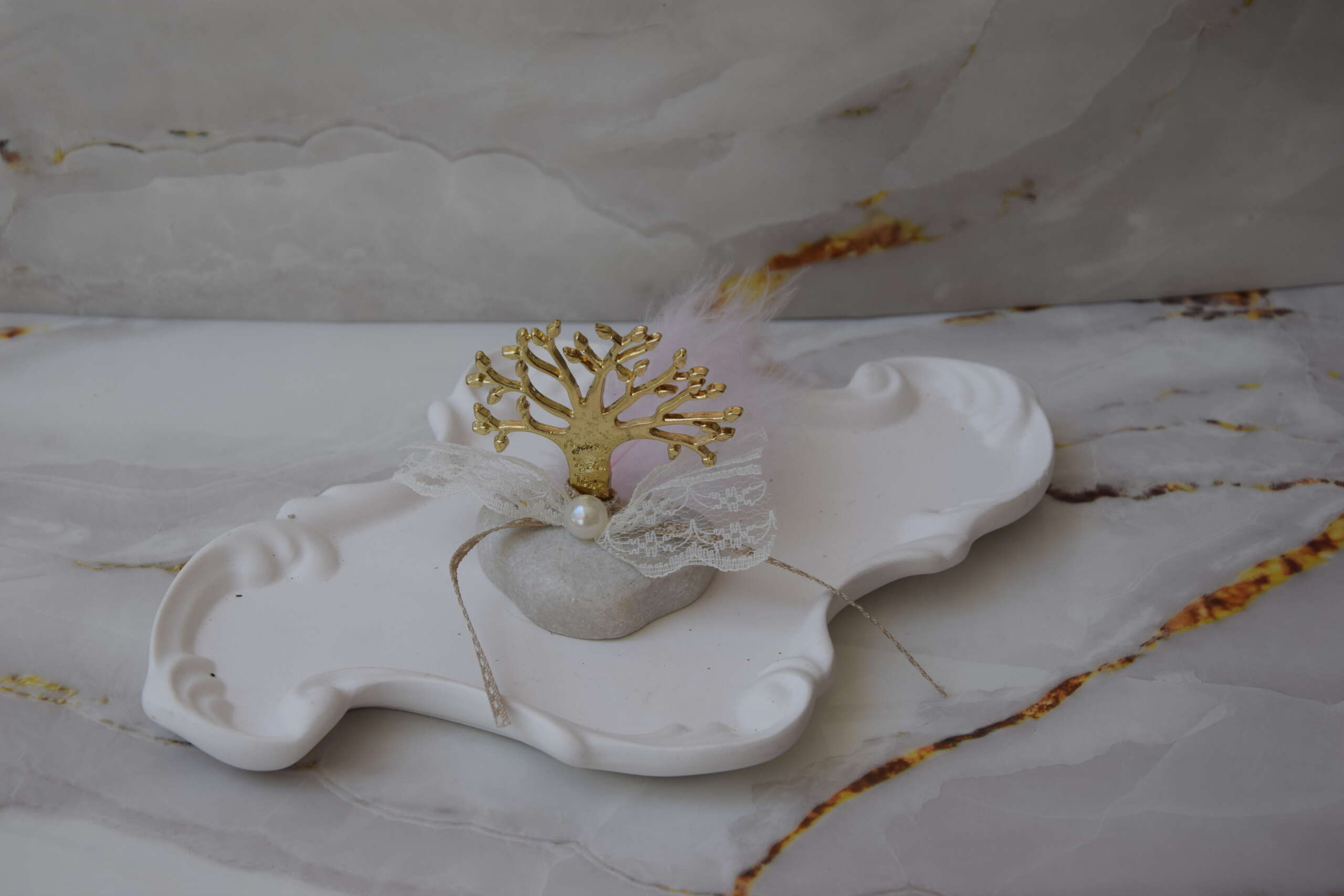 Κομψή μπομπονιέρα γάμου με διακοσμητικό Δέντρο Ζωής σε χρυσή απόχρωση, τοποθετημένο πάνω σε φυσική πέτρα. Η μπομπονιέρα διακοσμείται με δαντέλα, πέρλα και διακριτικά φτερά, δημιουργώντας ένα ρομαντικό και elegant αποτέλεσμα.