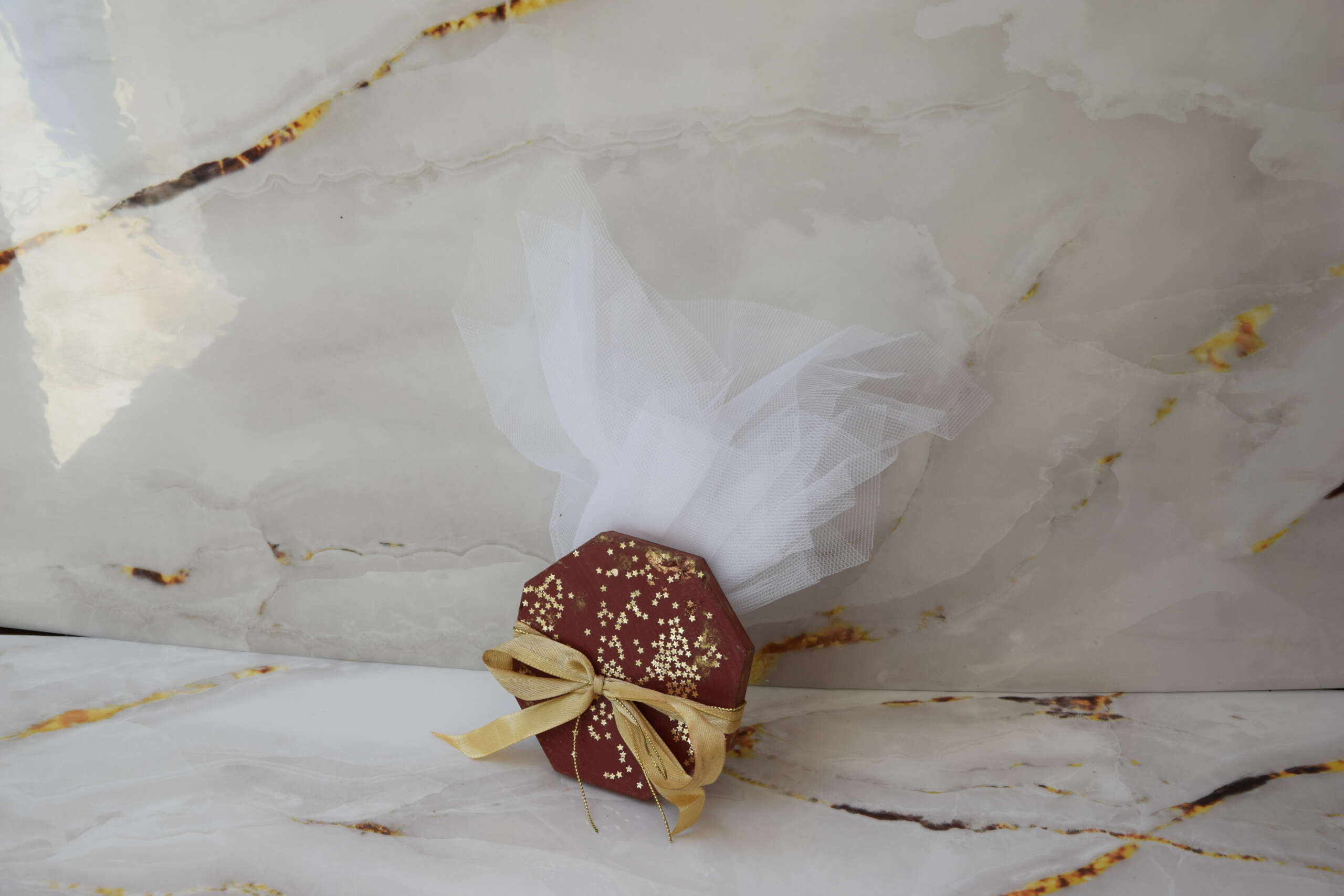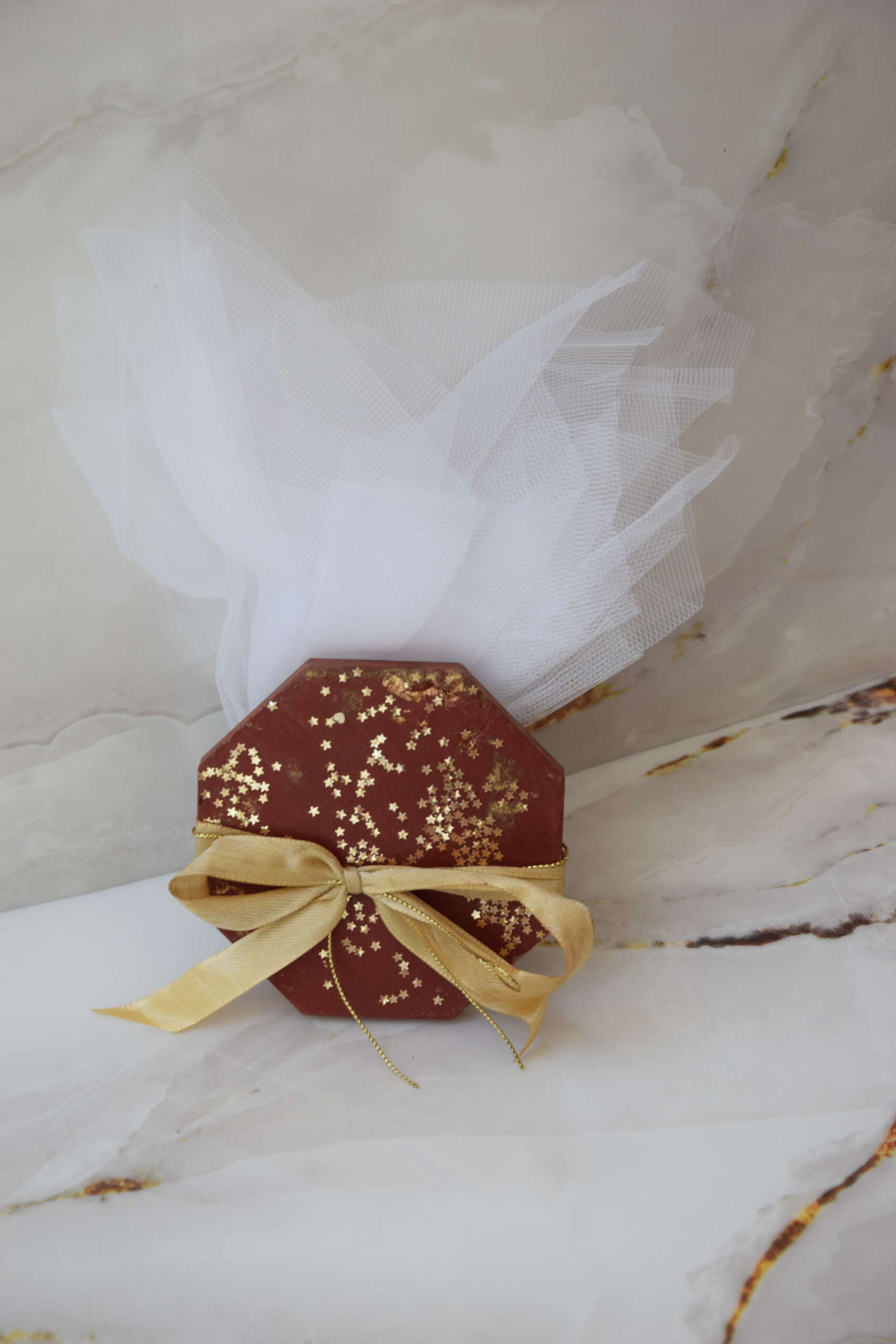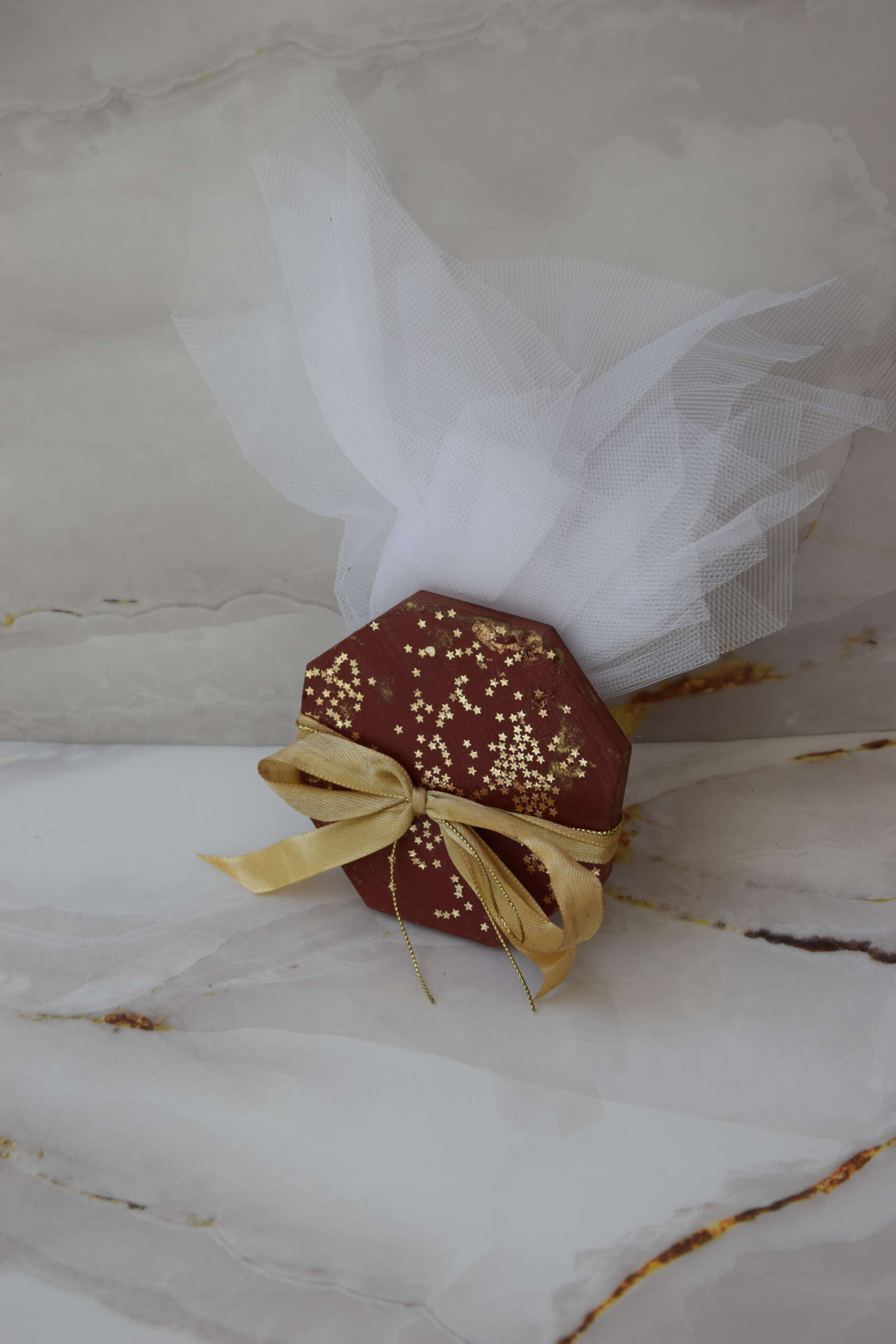 Κομψή μπομπονιέρα γάμου ή βάπτισης με πορσελάνινο σουβέρ σε ιδιαίτερο γεωμετρικό σχήμα, διακοσμημένο με χρυσά αστέρια που χαρίζουν μια λαμπερή και ρομαντική αισθητική. Η μπομπονιέρα συνοδεύεται από λευκό τούλι με κουφέτα και δένεται με σατέν κορδέλα σε χρυσή απόχρωση.