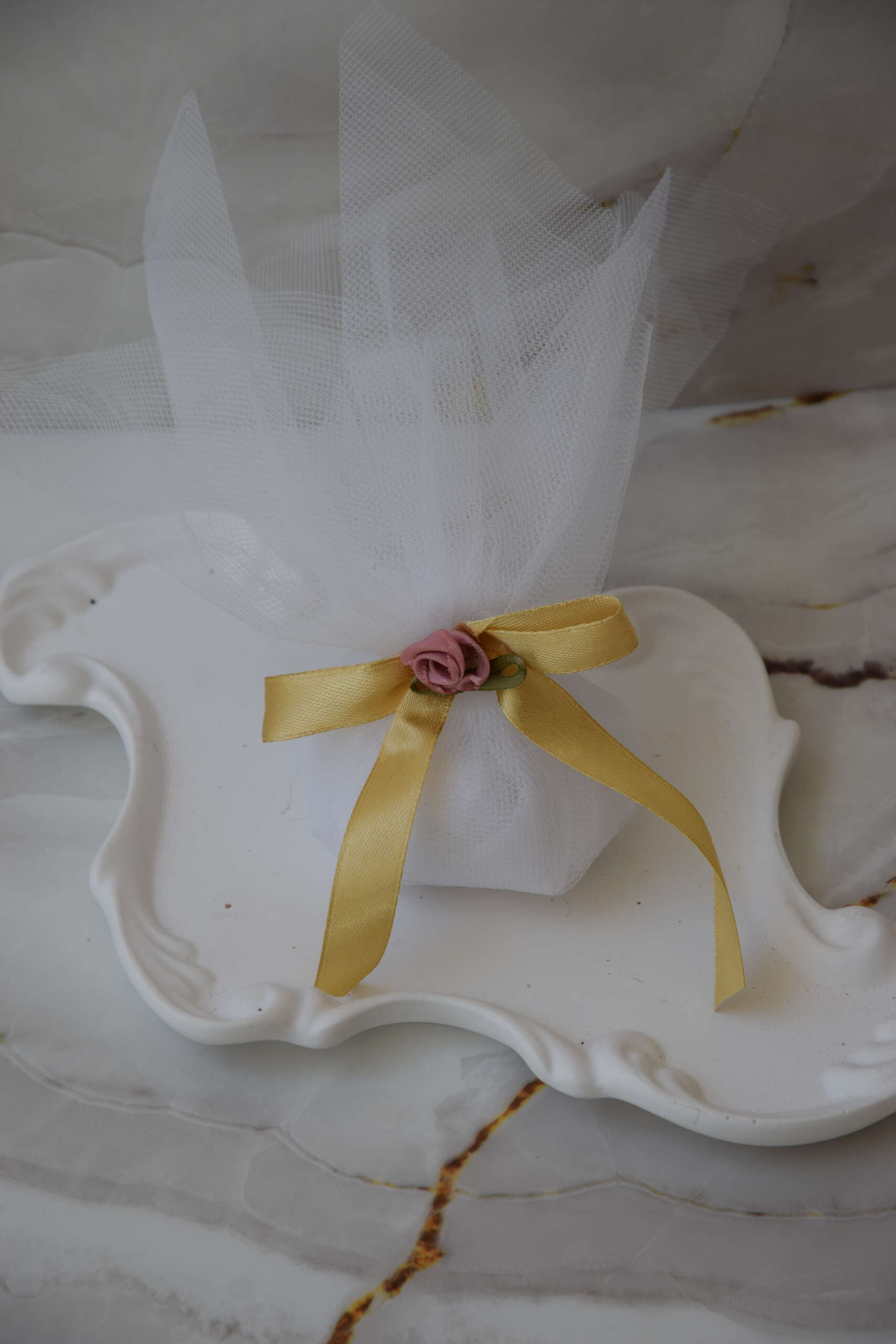 Ρομαντική και κομψή μπομπονιέρα γάμου με λευκό τούλι που αγκαλιάζει τα κουφέτα και δένεται με σατέν κορδέλα σε χρυσή απόχρωση. Στο κέντρο της διακόσμησης υπάρχει ένα μικρό διακριτικό ροζ τριαντάφυλλο, που χαρίζει μια ρομαντική και elegant πινελιά.