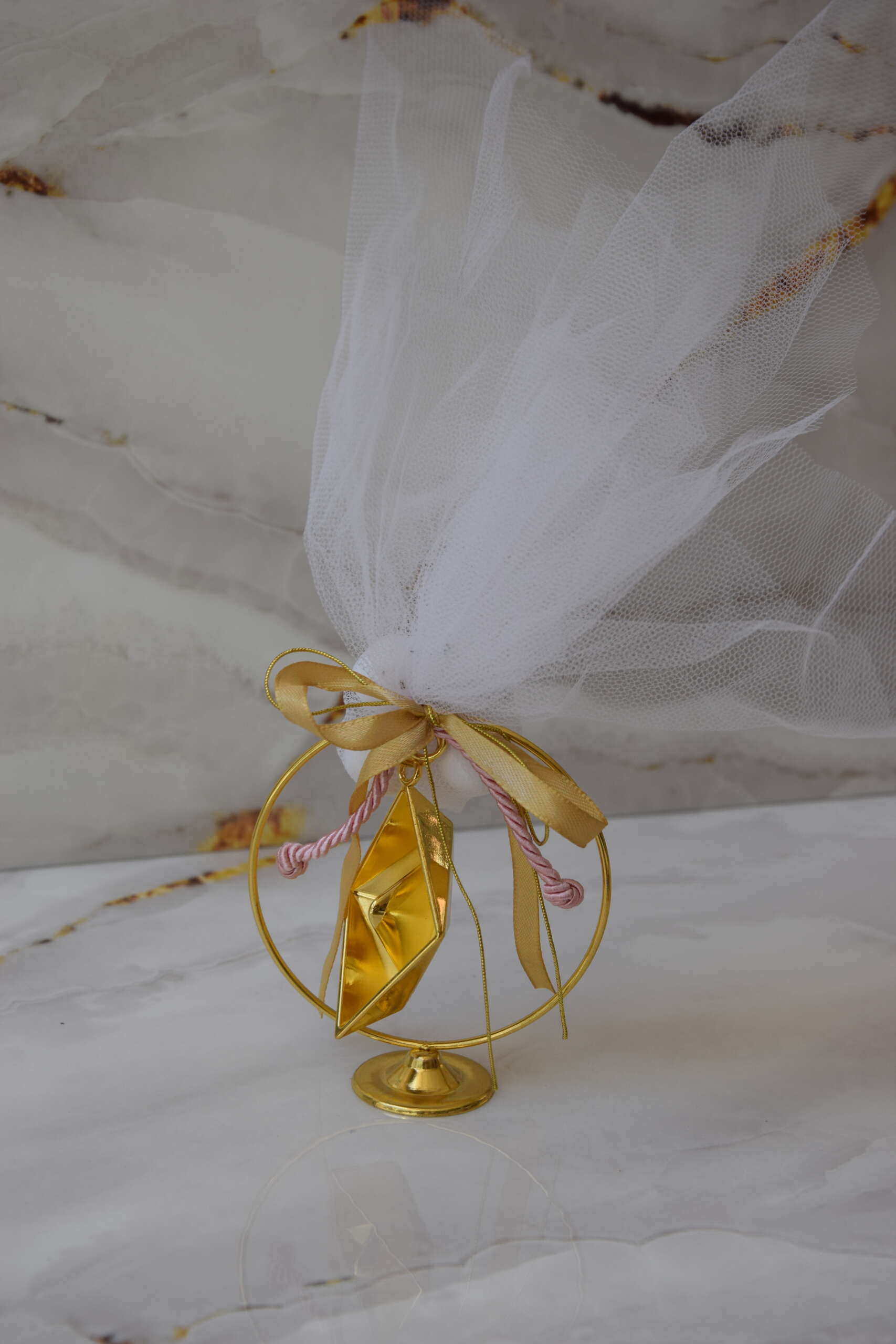 Αποτελείται από μεταλλική χρυσή βάση με κυκλικό στεφάνι και κρεμαστό χρυσό καραβάκι. Το τούλι (λευκό) δένει όμορφα στο κέντρο, ενώ η σύνθεση ολοκληρώνεται με σατέν κορδέλες σε χρυσή και ροζ απόχρωση, προσθέτοντας λάμψη και πολυτέλεια.
