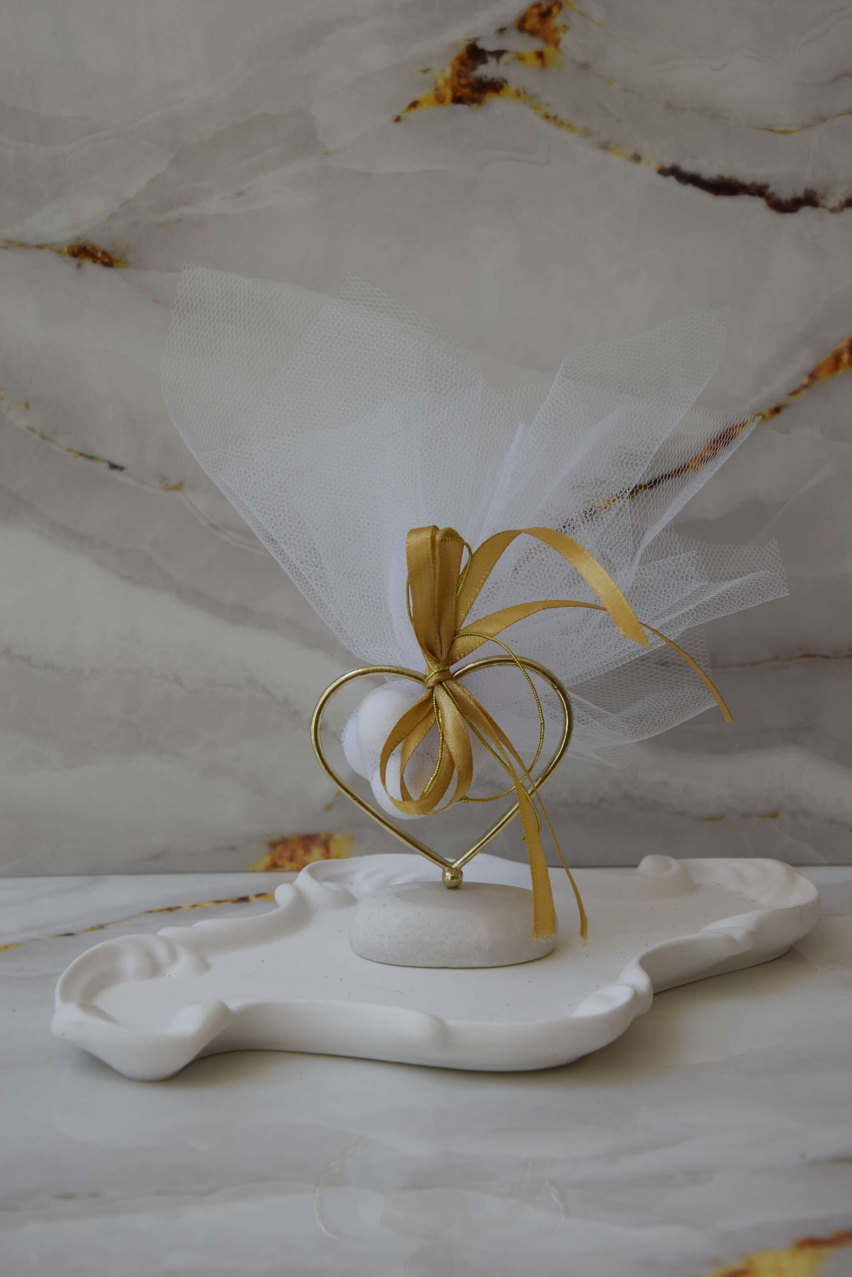 Χρυσή καρδιά με τούλι & σατέν κορδέλα Μπομπονιέρα με μεταλλική καρδιά σε χρυσό χρώμα, τοποθετημένη πάνω σε πέτρα και στολισμένη με λευκό τούλι και χρυσή κορδέλα. Κλασική και διαχρονική επιλογή που αποπνέει κομψότητα και ταιριάζει απόλυτα τόσο σε γάμο όσο και σε βάπτιση.