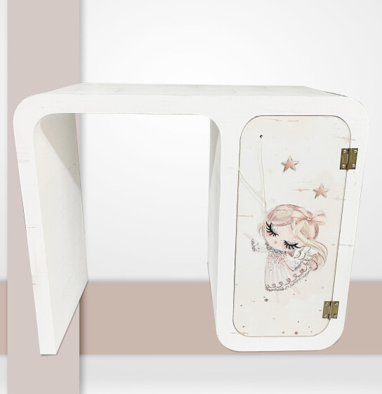 Χειροποίητο γραφείο–κουτί βάπτισης με ρομαντικό θέμα νεράιδα, ιδανικό για βάπτιση κοριτσιού. Ο κομψός σχεδιασμός σε απαλές μπεζ–ροζ αποχρώσεις και η ζωγραφική στο χέρι δημιουργούν ένα παραμυθένιο αποτέλεσμα που ταιριάζει υπέροχα σε παιδικό δωμάτιο. Διαθέτει πρακτικό ντουλαπάκι για αποθήκευση βαπτιστικών ειδών, ενώ μετά τη βάπτιση μπορεί να χρησιμοποιηθεί ως κανονικό γραφείο ή έπιπλο αποθήκευσης.