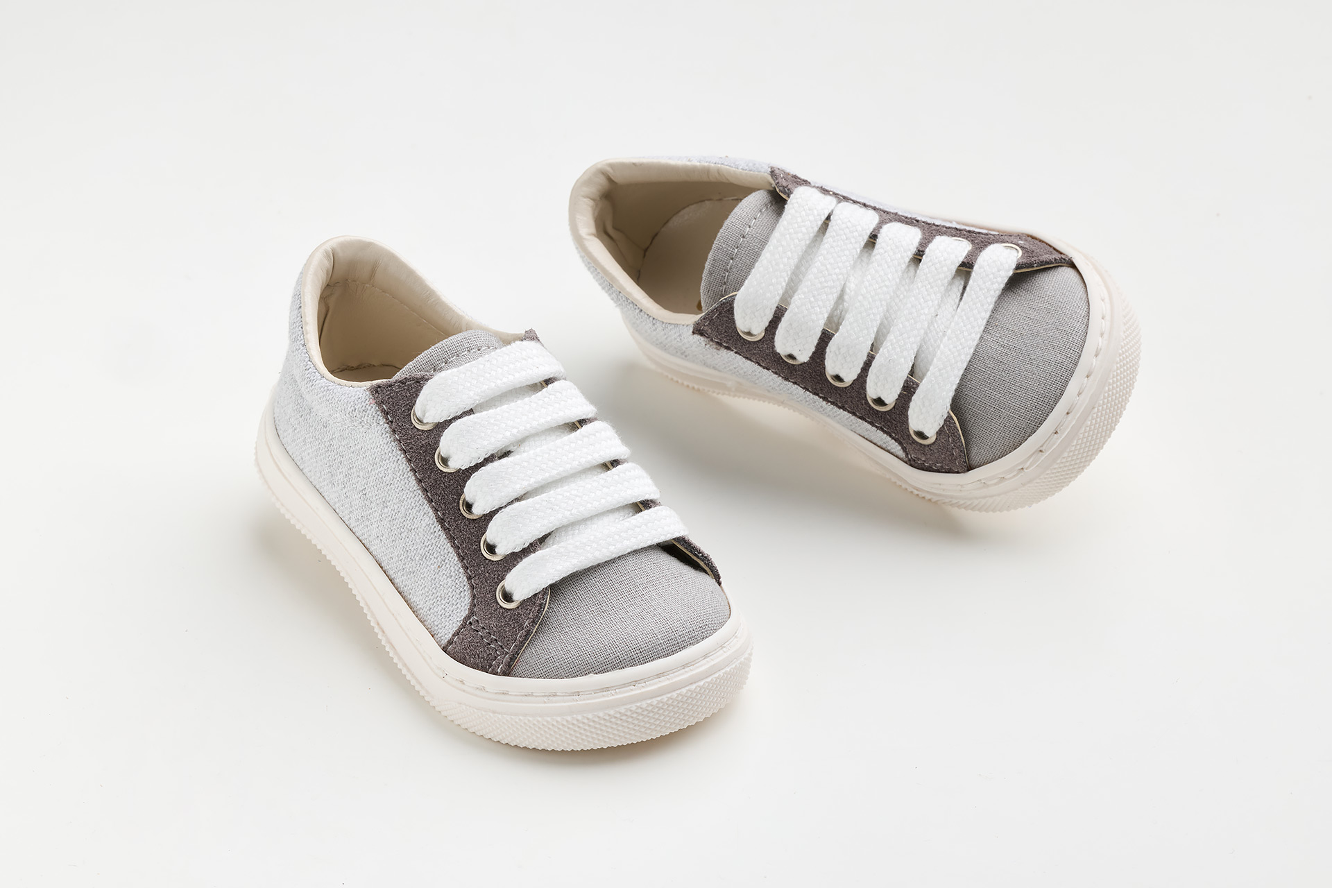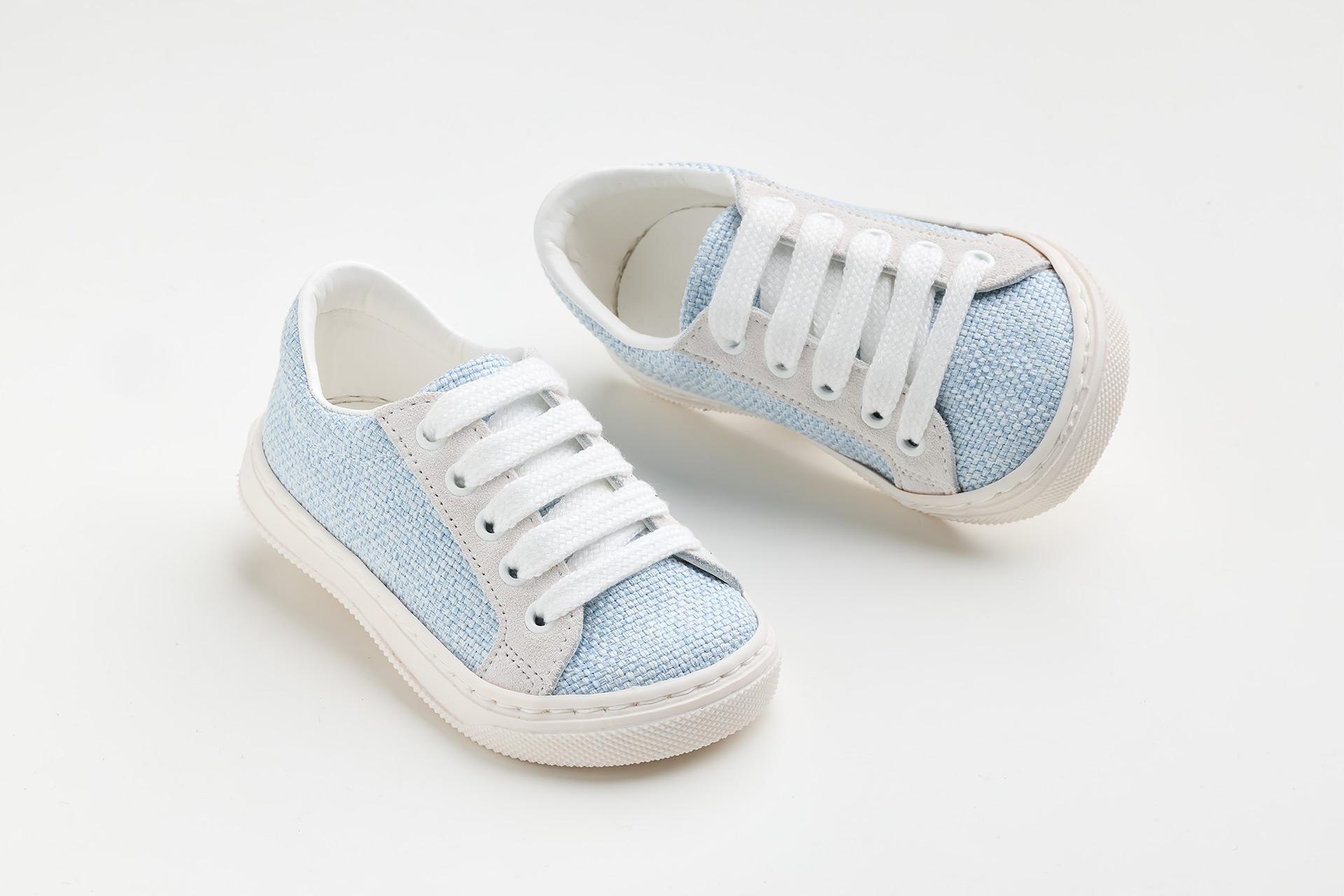 Παπουτσάκι περπατήματος σε γαλάζιο ύφασμα και λευκό καστόρ δέρμα.