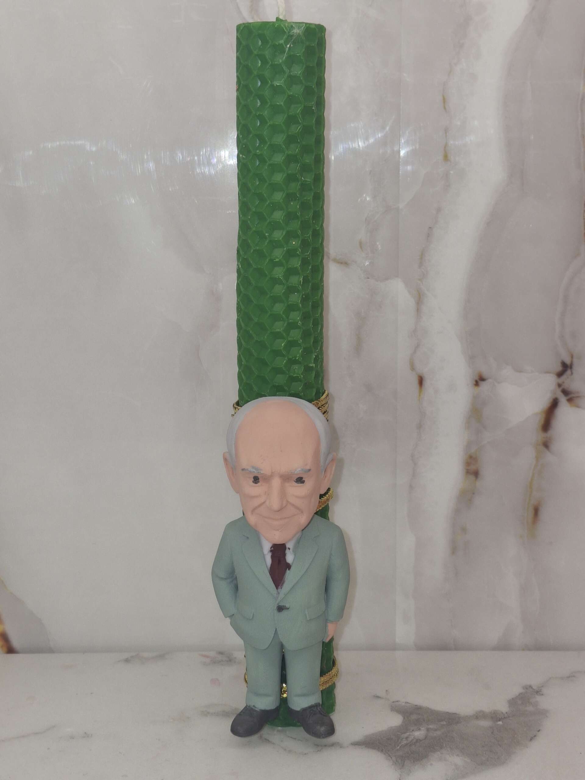 Πρωτότυπη πασχαλινή λαμπάδα από κερί κηρύθρας σε εντυπωσιακό πράσινο χρώμα, διακοσμημένη με φιγούρα του Andreas Papandreou σε 3d εμφάνιση. Μια ιδιαίτερη και χιουμοριστική λαμπάδα που ξεχωρίζει και αποτελεί μοναδική επιλογή δώρου για το Πάσχα.