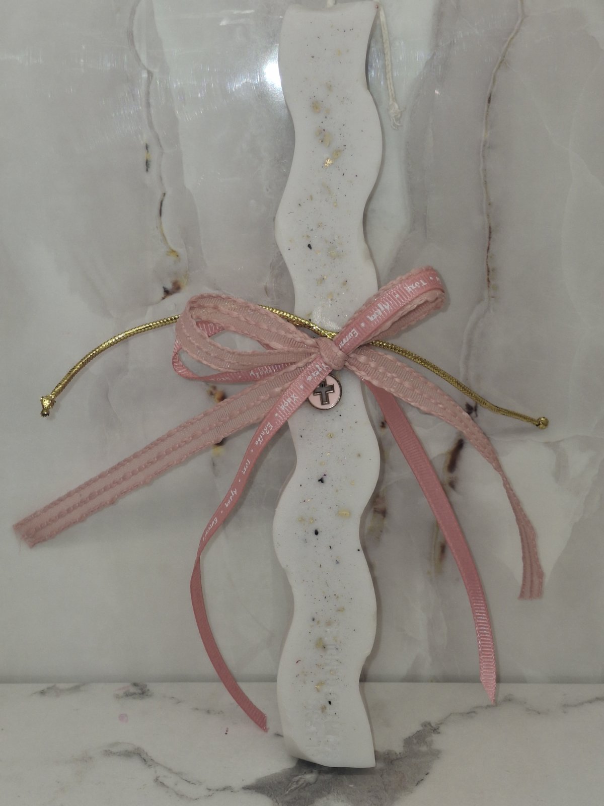 Κομψή χειροποίητη αρωματική πασχαλινή λαμπάδα σε λευκή απόχρωση με ιδιαίτερο κυματιστό σχέδιο. Είναι διακοσμημένη με ροζ κορδέλες και μικρό μεταλλικό σταυρουδάκι που χαρίζει μια διακριτική και κομψή πινελιά.