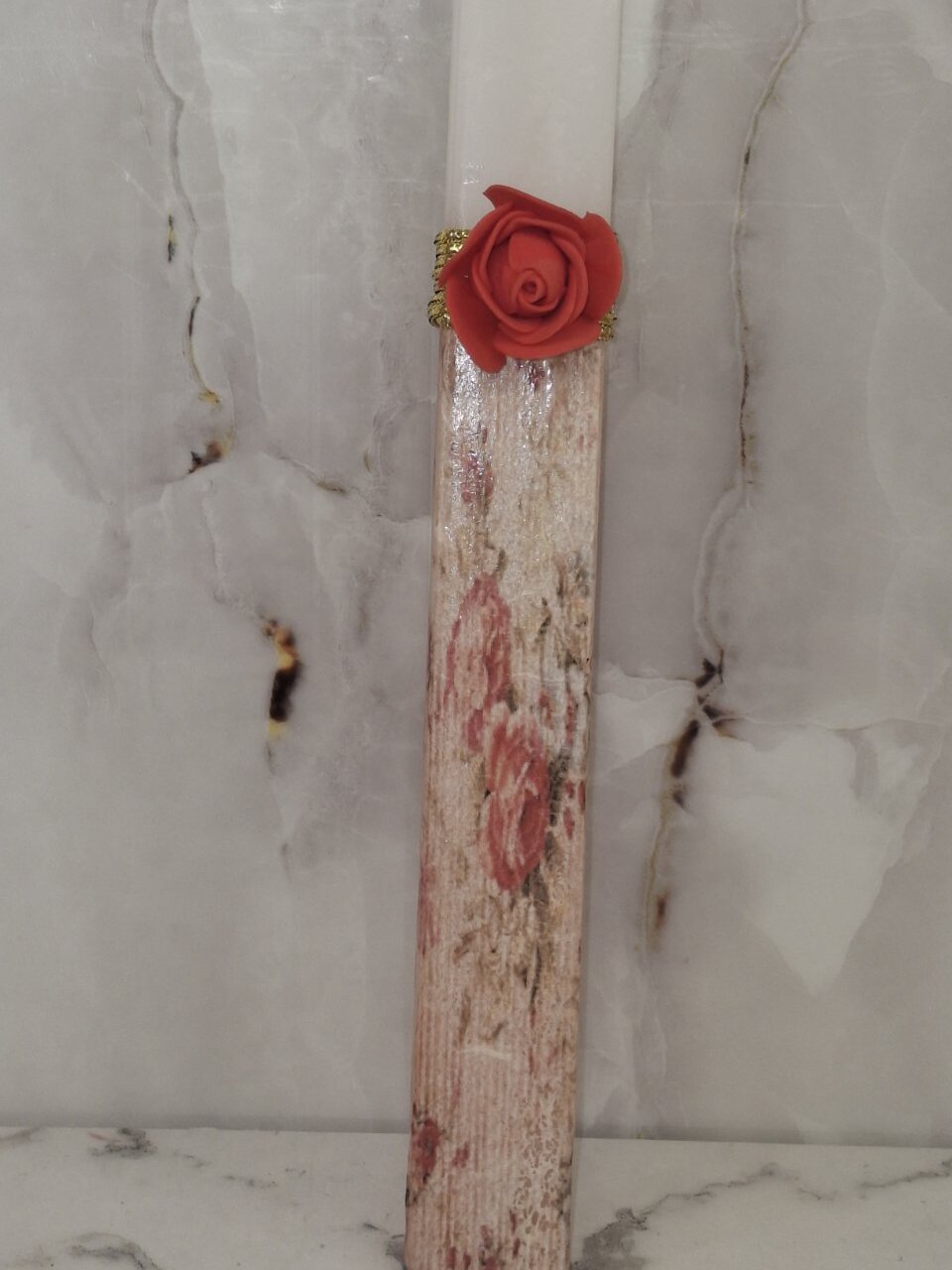 Μια εντυπωσιακή πασχαλινή λαμπάδα με ρομαντική αισθητική, διακοσμημένη με κόκκινο τριαντάφυλλο και χρυσές λεπτομέρειες που αποπνέουν κομψότητα και διαχρονικό στυλ.