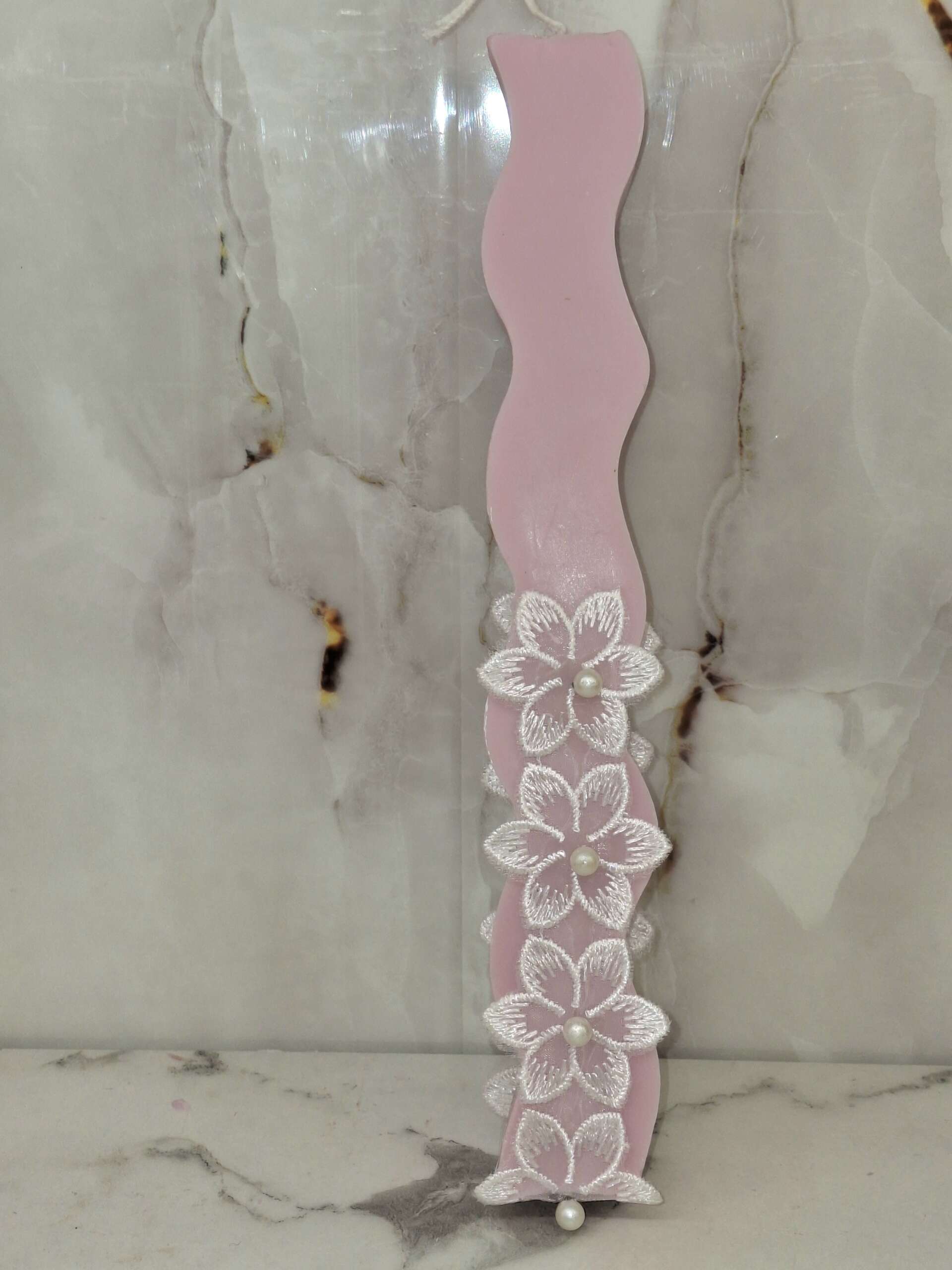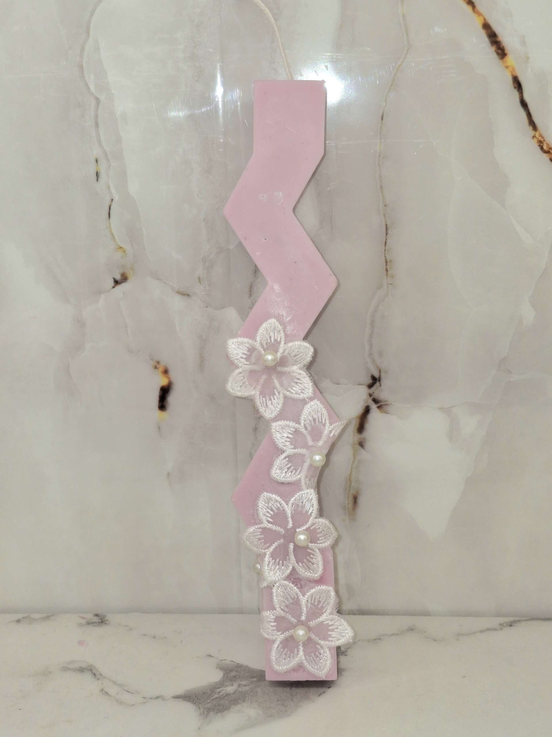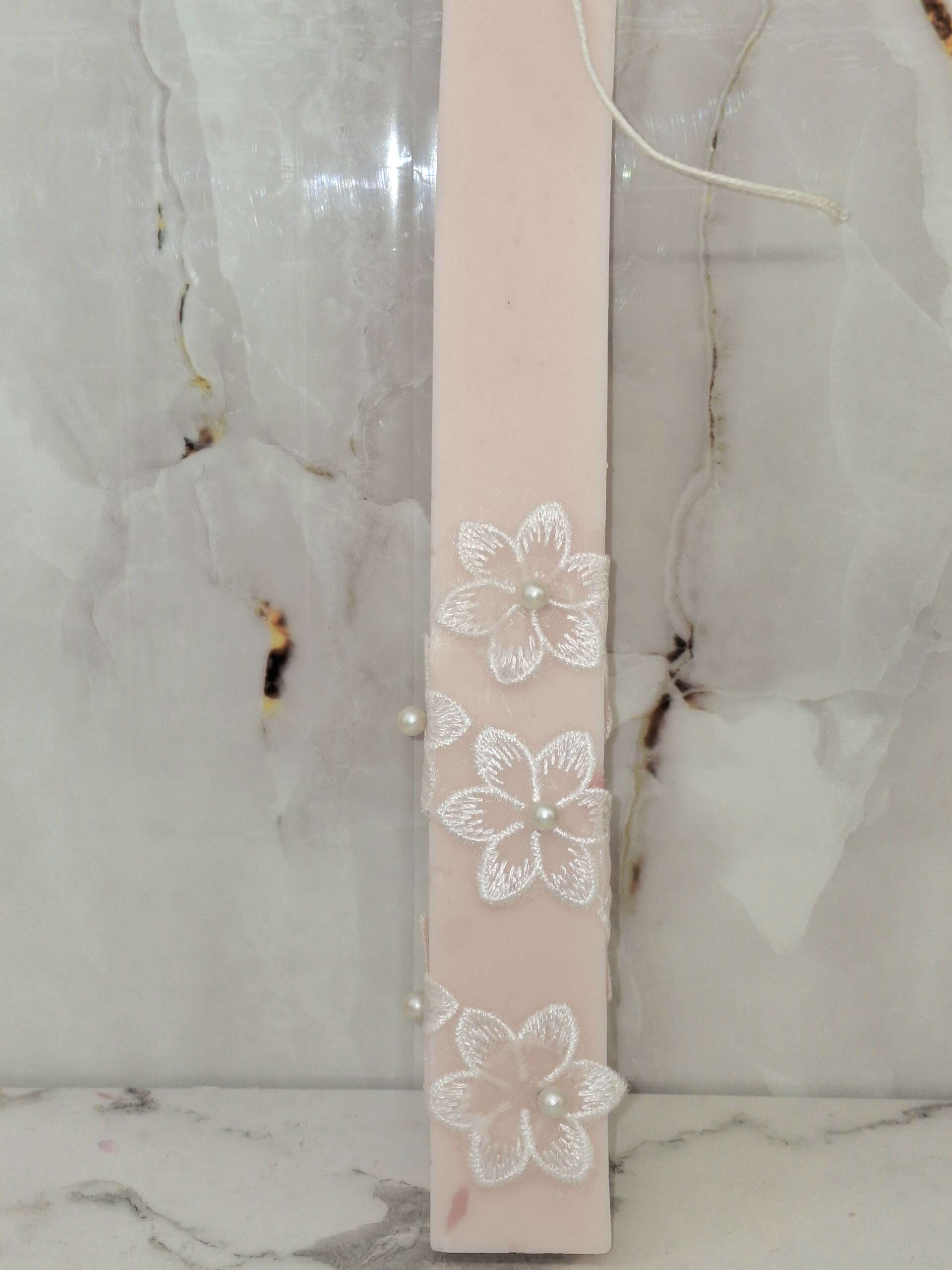 Μια κομψή και ρομαντική πασχαλινή λαμπάδα σε απαλό ροζ χρώμα, διακοσμημένη με ιδιαίτερο σχέδιο και όμορφα υφασμάτινα λουλούδια με πέρλες στο κέντρο.