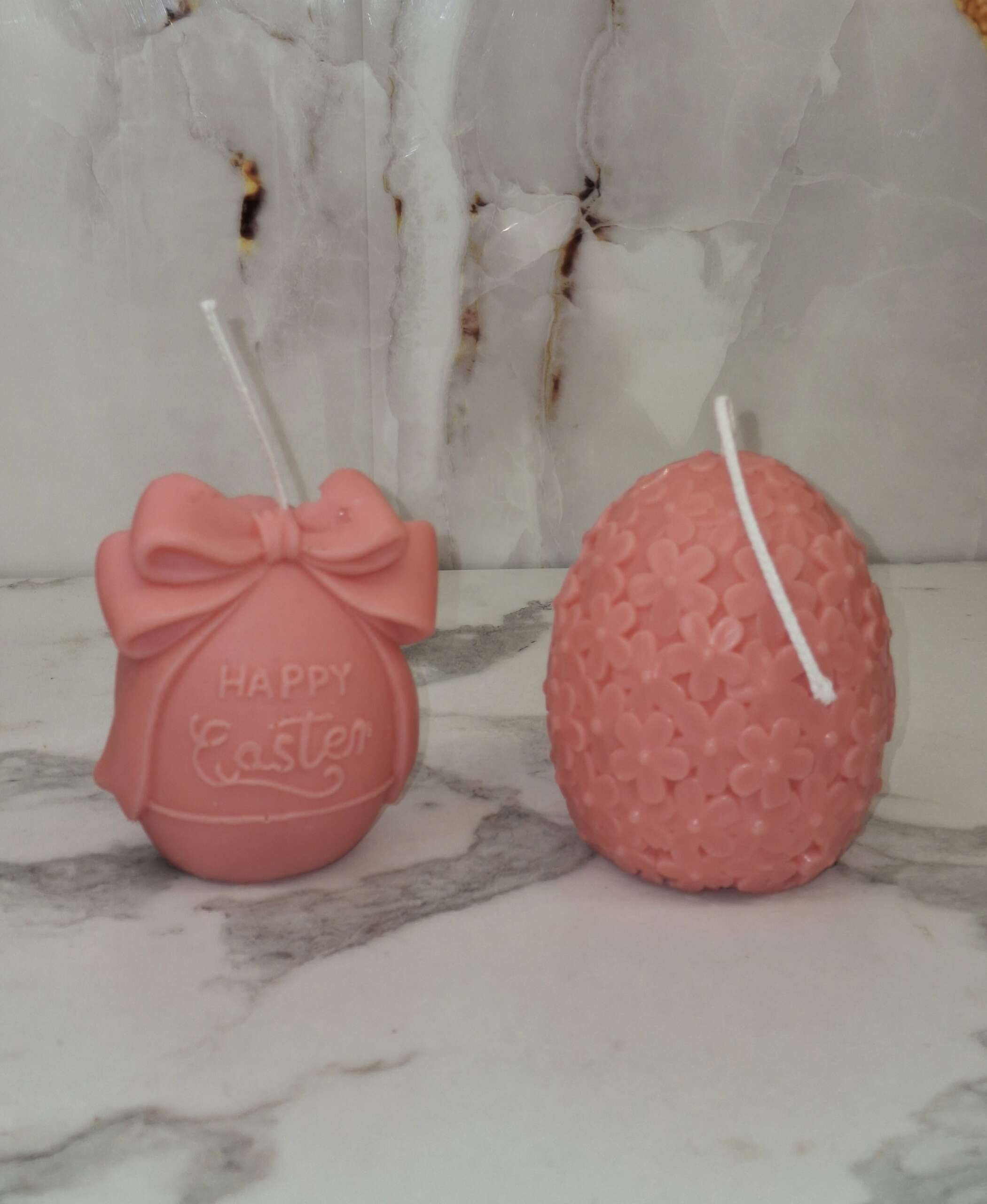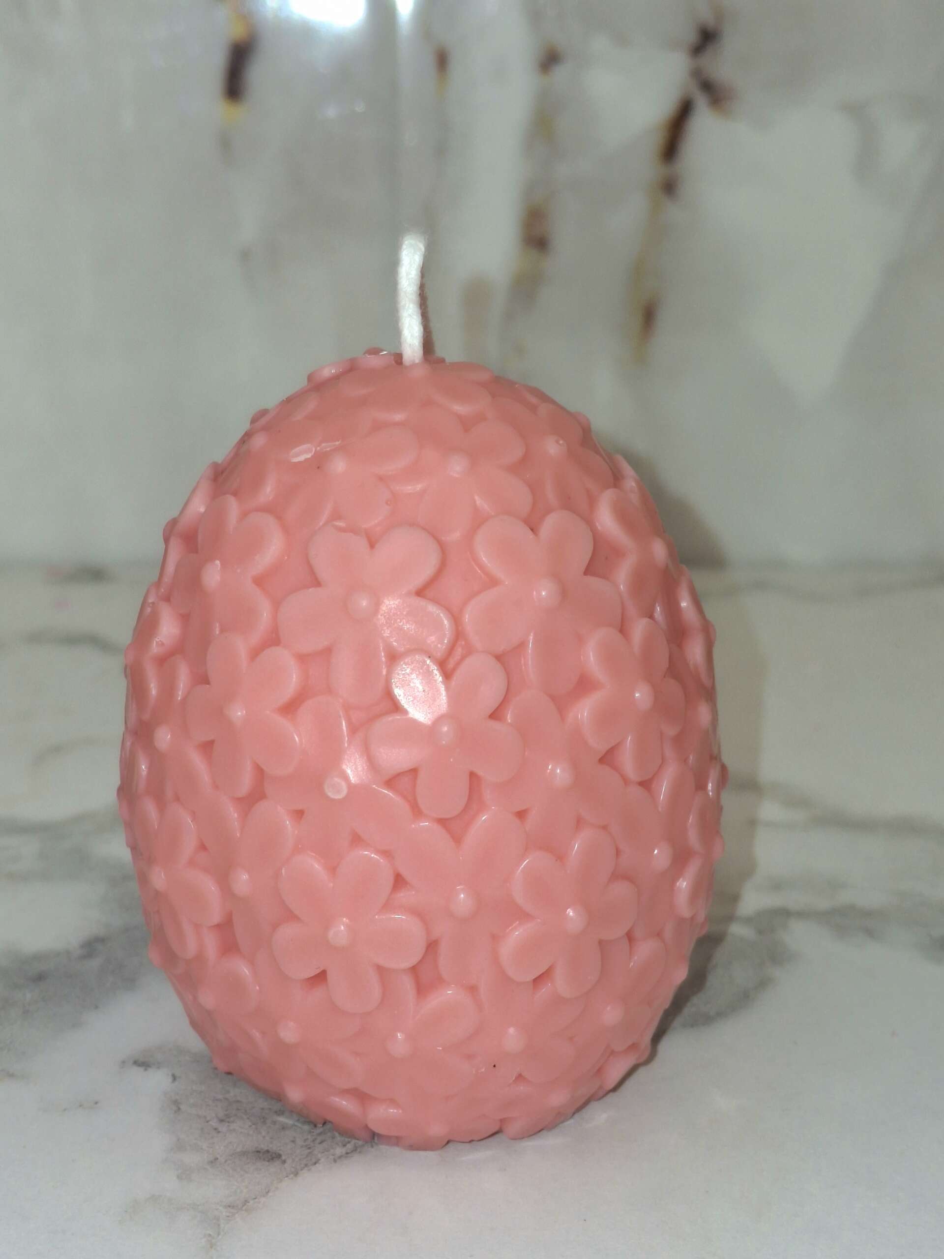 Ένα μοναδικό πασχαλινό κερί σε σχήμα αυγού, σε απαλή ροζ απόχρωση, διακοσμημένο με ανάγλυφα λουλούδια που δημιουργούν ένα εντυπωσιακό και ρομαντικό αποτέλεσμα.