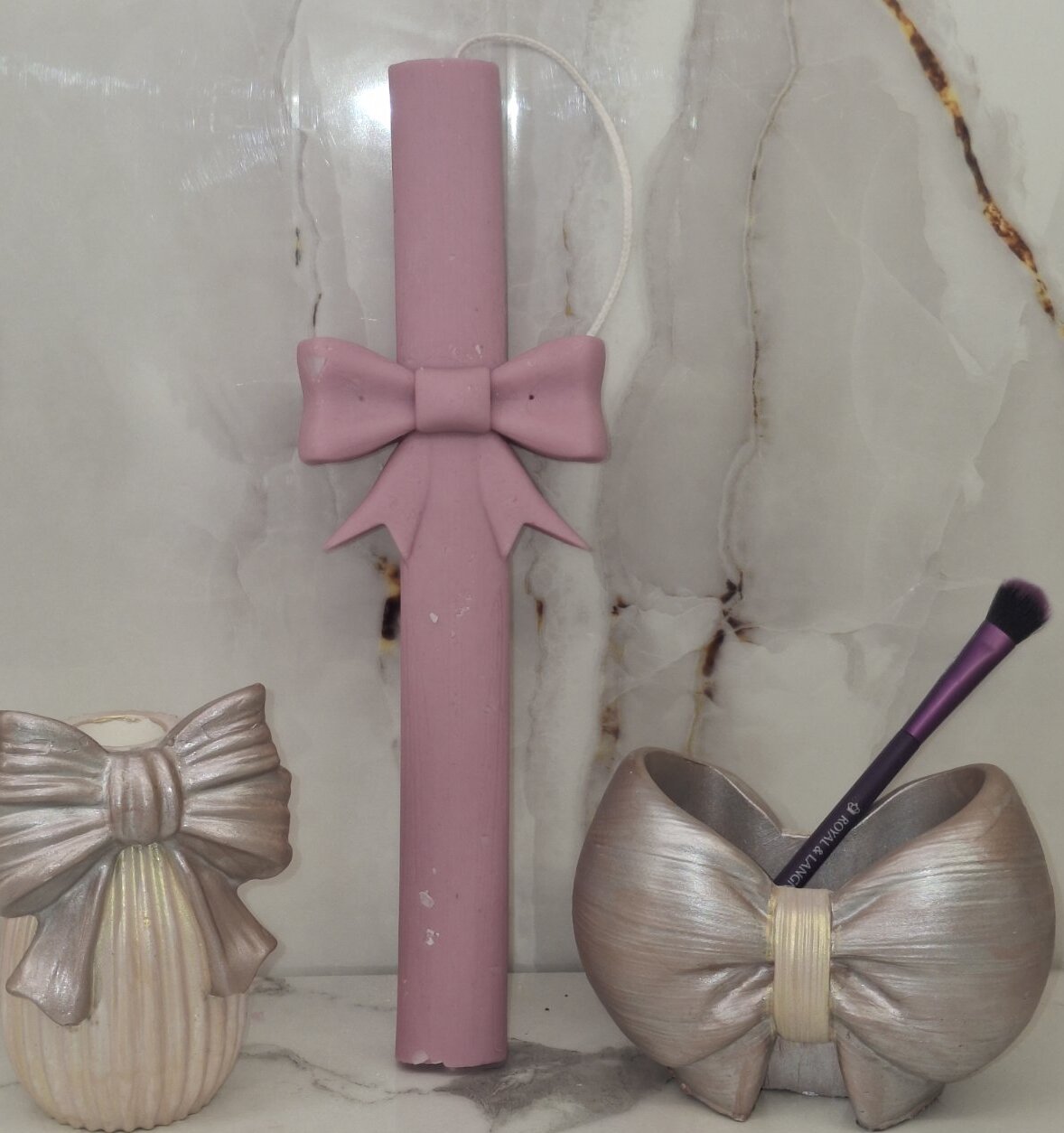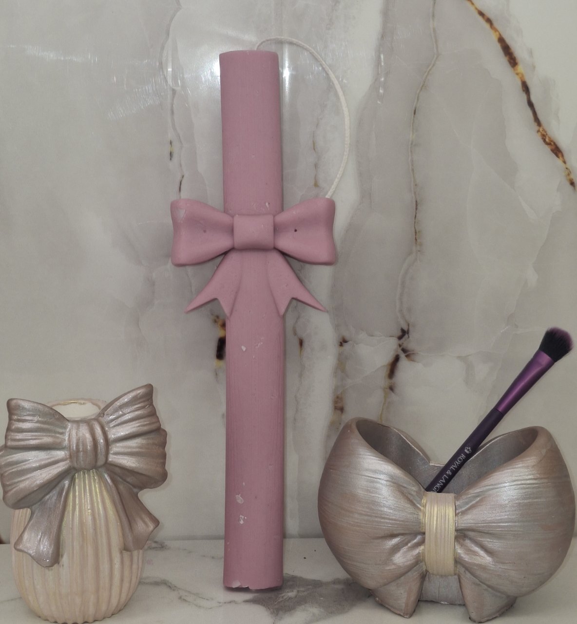Κομψό πασχαλινό σετ δώρου που περιλαμβάνει χειροποίητη αρωματική πασχαλινή λαμπάδα διακοσμημένη με όμορφο φιόγκο. Το σετ συνοδεύεται από διακοσμητικά δοχεία πορσελάνης σε σχήμα φιόγκου, ιδανικά για οργάνωση πινέλων μακιγιάζ, στυλό ή μικροαντικειμένων.