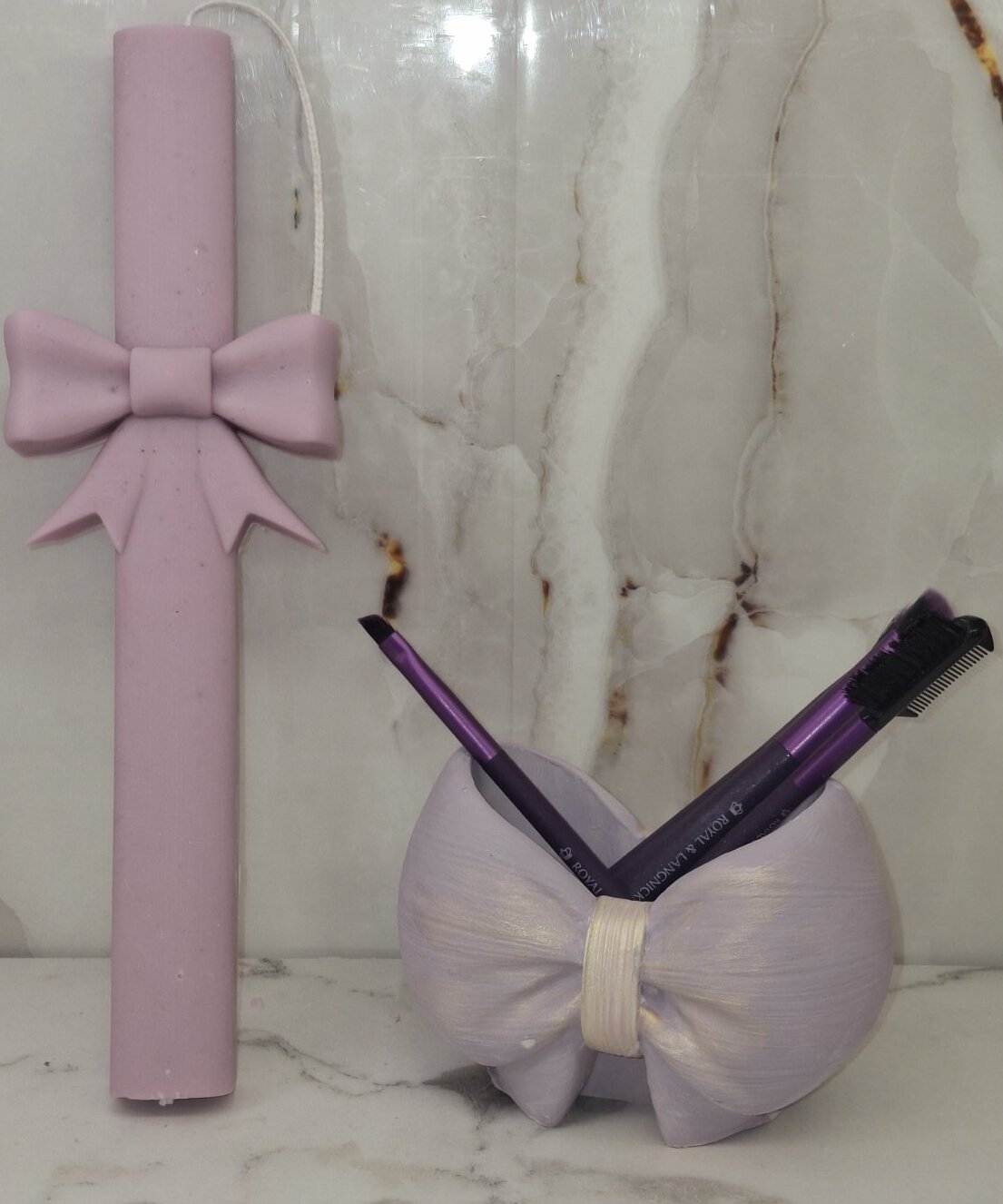 Το σετ περιλαμβάνει χειροποίητη πασχαλινή λαμπάδα διακοσμημένη με κομψό φιόγκο, καθώς και μολυβοθήκη σε σχήμα φιόγκου, ιδανική για αποθήκευση πινέλων μακιγιάζ, στυλό ή μικρών αντικειμένων.