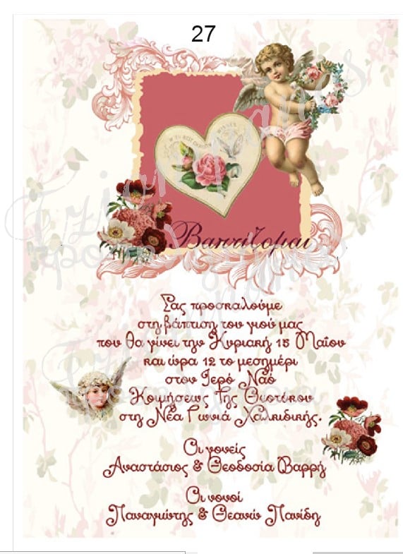 Ρομαντικό προσκλητήριο βάπτισης σε vintage αισθητική, με γλυκιά απεικόνιση αγγέλου και καρδιά διακοσμημένη με λουλούδια σε απαλούς ροζ και εκρού τόνους. Η σύνθεση πλαισιώνεται από φίνα floral στοιχεία και κλασικά διακοσμητικά μοτίβα, δημιουργώντας ένα ιδιαίτερα κομψό και τρυφερό αποτέλεσμα.