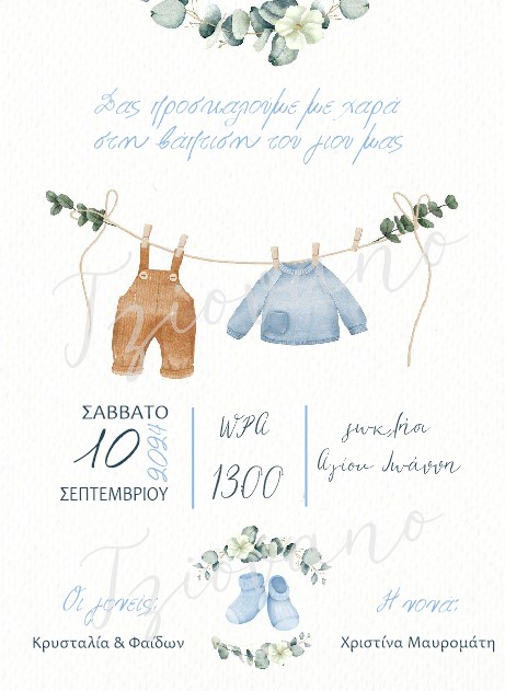 Γλυκό και minimal προσκλητήριο βάπτισης για αγόρι, με θέμα παιδικά ρούχα σε σχοινάκι, διακοσμημένο με φορμάκι, πουλοβεράκι και καλτσάκια σε απαλούς μπλε και γήινους τόνους. Τα διακριτικά φυλλώματα και η λιτή αισθητική δημιουργούν ένα φυσικό και κομψό αποτέλεσμα, ιδανικό για μια τρυφερή και μοντέρνα βάπτιση.