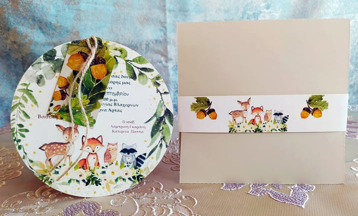 Χαριτωμένο και ιδιαίτερο προσκλητήριο βάπτισης με θέμα τα ζωάκια του δάσους, ιδανικό για αγόρι ή κορίτσι. Αποτελείται από στρογγυλή κάρτα υψηλής ποιότητας με υπέροχη εικονογράφηση (ελαφάκι, αλεπουδίτσα, κουκουβάγια κ.ά.) σε φυσικές αποχρώσεις, δεμένη με σπάγγο για rustic αισθητική.