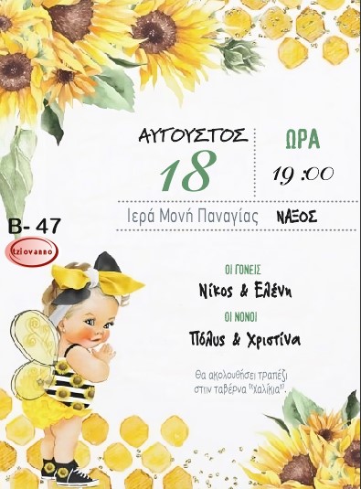 Φωτεινό και παιχνιδιάρικο προσκλητήριο βάπτισης με θέμα μελισσούλα, διακοσμημένο με χαριτωμένο παιδικό σχέδιο, κηρήθρες και εντυπωσιακούς ηλίανθους. Οι ζεστές κίτρινες αποχρώσεις σε συνδυασμό με το λευκό φόντο δημιουργούν ένα χαρούμενο και καλοκαιρινό αποτέλεσμα, ιδανικό για βάπτιση τους καλοκαιρινούς μήνες.