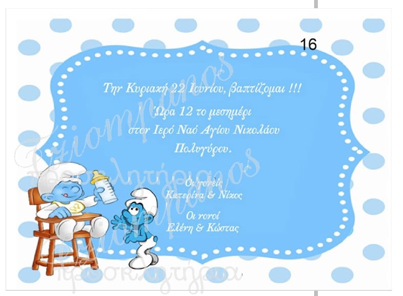 Η χαριτωμένη εικονογράφηση με το στρουμφάκι στο καρεκλάκι και το μπιμπερό προσδίδει παιδική αθωότητα και χαμόγελο, ενώ το καθαρό layout αναδεικνύει εύκολα τις πληροφορίες της τελετής.