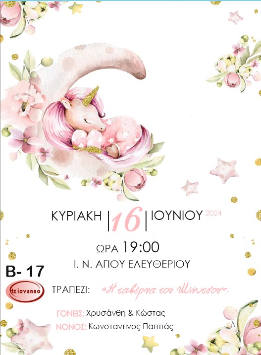 Τρυφερό και παραμυθένιο προσκλητήριο βάπτισης με μικρό μονόκερο που κοιμάται στο φεγγάρι, σε απαλές ροζ και παστέλ αποχρώσεις. Ο υδατογραφημένος σχεδιασμός με λουλούδια, αστέρια και χρυσές λεπτομέρειες δημιουργεί μια μαγική και ρομαντική ατμόσφαιρα, ιδανική για βάπτιση κοριτσιού.
